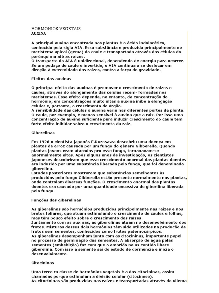 AUXINA A principal auxina encontrada nas plantas o cido indolactico, conhecido pela sigla AIA. Essa substncia produzida principalmente no meristema apical (gema) do caule e transportada atravs das clulas do parnquima at as razes. O transporte do AIA unidirecional, dependendo de energia para ocorrer. Se um pedao de caule invertido, o AIA continua a se deslocar em direo extremidade das razes, contra a fora de gravidade. Efeitos das auxinas O principal efeito das auxinas promover o crescimento de razes e caules, atravs do alongamento das clulas recm- formadas nos meristemas. Esse efeito depende, no entanto, da concentrao do hormnio; em concentraes muito altas a auxina inibe a elongao celular e, portanto, o crescimento do rgo. A sensibilidade das clulas auxina varia nas diferentes partes da planta. O caule, por exemplo, menos sensvel auxina que a raiz. Por isso uma concentrao de auxina suficiente para induzir crescimento do caule tem forte efeito inibidor sobre o crescimento da raiz. Giberelinas Em 1926 o cientista japons E.Kurosawa descobriu uma doena em plantas de arroz causada por um fungo do gnero Gibberella. Quando plantas jovens eram atacadas pro esse fungo, tornanavam-se anormalmente altas. Aps alguns anos de investigao, os cientistas japoneses descobriram que esse crescimento anormal das plantas doentes era induzido por uma substncia liberada pelo fungo, que foi denominada giberelina. Estudos posteriores mostraram que substncias semelhantes s produzidas pelo fungo Gibberella esto presente normalmente nas plantas, onde controlam diversas funes. O crescimento anormal das plantas doentes era causado por uma quantidade excessiva de giberilina liberada pelo fungo. Funes das giberelinas As giberelinas so hormnios produzidos principalmente nas razes e nos brotos foliares, que atuam estimulando o crescimento de caules e folhas, mas tm pouco efeito sobre o crescimento das razes. Juntamente com as auxinas, as giberelinas atuam no desenvolvimento dos frutos. Misturas desses dois hormnios tm sido utilizadas na produo de frutos sem sementes, conhecidos como frutos paternocrpicos. As giberelinas desempenham junto com as citocininas, importante papel no processo de germinao das sementes. A absoro de gua pelas sementes (embebio) faz com que o embrio nelas contido libere giberelina. Com isso a semente sai do estado de dormncia e inicia o desenvolvimento. Citocininas Uma terceira classe de hormnios vegetais a das citocininas, assim chamadas porque estimulam a diviso celular (citocinese). As citocininas so produzidas nas razes e transportadas atravs do xilema