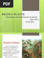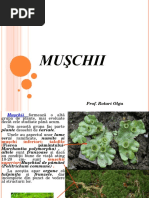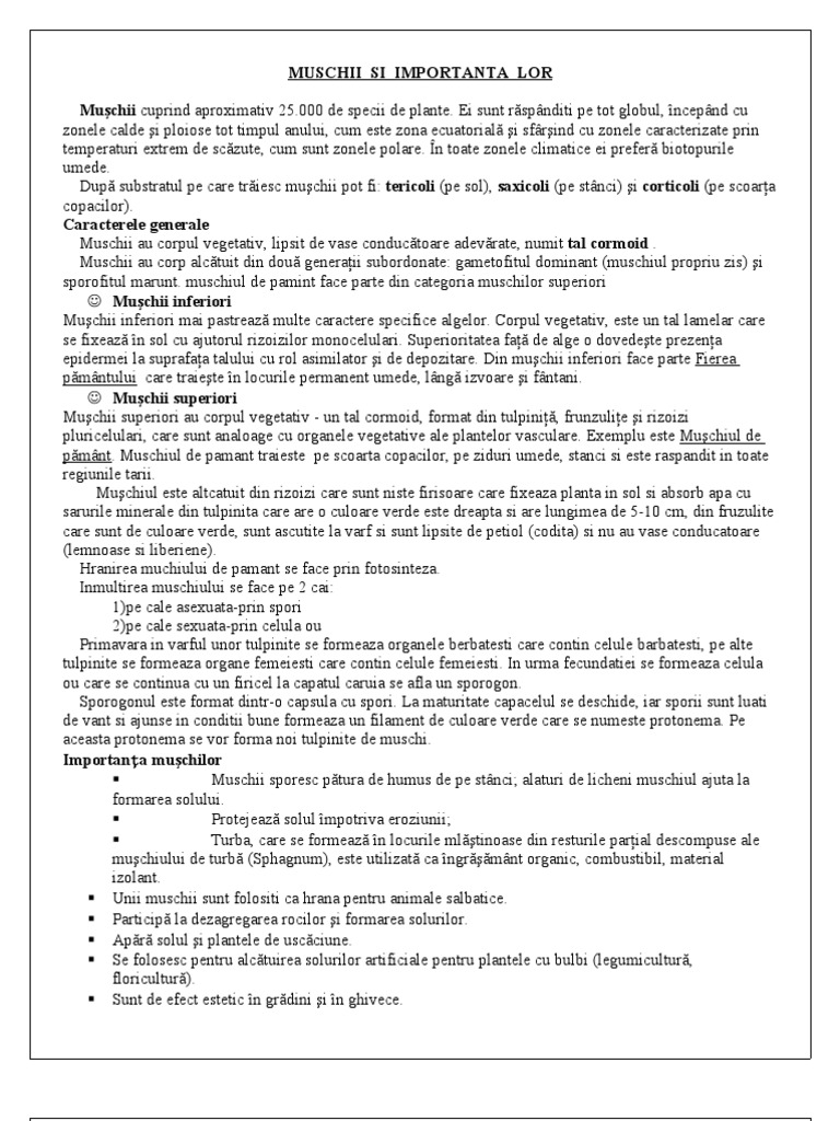 Ei sunt rspnditi pe tot globul, ncepnd cu zonele calde i ploiose tot timpul anului, cum este zona ecuatorial i sfrind cu zonele caracterizate prin temperaturi extrem de sczute, cum sunt zonele polare. n toate zonele climatice ei prefer biotopurile umede. Dup substratul pe care triesc muchii pot fi: tericoli (pe sol), saxicoli (pe stnci) i corticoli (pe scoara copacilor). Caracterele generale Muschii au corpul vegetativ, lipsit de vase conductoare adevrate, numit tal cormoid . Muschii au corp alctuit din dou generaii subordonate: gametofitul dominant (muschiul propriu zis) i sporofitul marunt. muschiul de pamint face parte din categoria muschilor superiori Muchii inferiori Muchii inferiori mai pastreaz multe caractere specifice algelor. Corpul vegetativ, este un tal lamelar care se fixeaz n sol cu ajutorul rizoizilor monocelulari. Superioritatea fa de alge o dovedete prezena epidermei la suprafaa talului cu rol asimilator i de depozitare. Din muchii inferiori face parte Fierea pmntului care traiete n locurile permanent umede, lng izvoare i fntani. Muchii superiori Muchii superiori au corpul vegetativ - un tal cormoid, format din tulpini, frunzulie i rizoizi pluricelulari, care sunt analoage cu organele vegetative ale plantelor vasculare. Exemplu este Muchiul de pmnt. Muschiul de pamant traieste pe scoarta copacilor, pe ziduri umede, stanci si este raspandit in toate regiunile tarii. Muchiul este altcatuit din rizoizi care sunt niste firisoare care fixeaza planta in sol si absorb apa cu sarurile minerale din tulpinita care are o culoare verde este dreapta si are lungimea de 5-10 cm, din fruzulite care sunt de culoare verde, sunt ascutite la varf si sunt lipsite de petiol (codita) si nu au vase conducatoare (lemnoase si liberiene). Hranirea muchiului de pamant se face prin fotosinteza. Inmultirea muschiului se face pe 2 cai: 1)pe cale asexuata-prin spori 2)pe cale sexuata-prin celula ou Primavara in varful unor tulpinite se formeaza organele berbatesti care contin celule barbatesti, pe alte tulpinite se formeaza organe femeiesti care contin celule femeiesti. In urma fecundatiei se formeaza celula ou care se continua cu un firicel la capatul caruia se afla un sporogon. Sporogonul este format dintr-o capsula cu spori. La maturitate capacelul se deschide, iar sporii sunt luati de vant si ajunse in conditii bune formeaza un filament de culoare verde care se numeste protonema. Pe aceasta protonema se vor forma noi tulpinite de muschi. Importana muchilor Muschii sporesc ptura de humus de pe stnci; alaturi de licheni muschiul ajuta la formarea solului. Protejeaz solul mpotriva eroziunii; Turba, care se formeaz n locurile mltinoase din resturile parial descompuse ale muchiului de turb (Sphagnum), este utilizat ca ngrmnt organic, combustibil, material izolant. Unii muschii sunt folositi ca hrana pentru animale salbatice. Particip la dezagregarea rocilor i formarea solurilor. Apr solul i plantele de uscciune. Se folosesc pentru alctuirea solurilor artificiale pentru plantele cu bulbi (legumicultur, floricultur). Sunt de efect estetic n grdini i n ghivece.