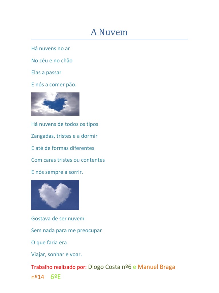 Gostava de ser nuvem Sem nada para me preocupar O que faria era Viajar, sonhar e voar. Trabalho realizado por: Diogo Costa n6 e Manuel Braga