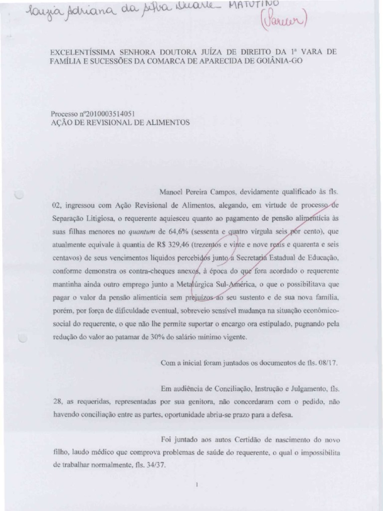 Manoel Pereira Campos, devidamente qualificado s fls. 02, ingressou com Ao Revisional de Alimentos, alegando, em virtude de processoxde Separao Litigiosa, o requerente aquiesceu quanto ao pagamento de penso alimentcia s suas filhas menores no quanium de 64,6% (sessenta e quatro vrgula seis .por cento), que atualmente eqivale quantia de R$ 329.46 (trezentos e vijUe e nove rets e quarenta e seis centavos) de seus vencimentos lquidos percebidos junto/a Secretaria Estadual de Educao, conforme demonstra os contra-cheques anexq. poca do que fora acordado o requerente mantinha ainda outro emprego junto a Metalrgica Sul-Amrica, o que o possibilitava que pagar o valor da penso alimentcia sem prejujzos^ao seu sustento c de sua nova famlia, porm, por fora de dificuldade eventual, sobreveio sensvel mudana na situao econmicosocial do requerente, o que no lhe permite suportar o encargo ora estipulado, pugnando pela reduo do valor ao patamar de 30% do salrio mnimo vigente.