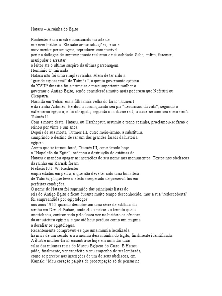 s. Ele sabe armar situaes, criar e movimentar personagens, reproduzir com incrvel percia dilogos de impressionante realismo e naturalidade. Sabe, enfim, fascinar, manipular e arrastar o leitor at o ltimo suspiro da ltima personagem. Herminio C. miranda Hatasu no foi uma simples rainha. Alm de ter sido a grande esposa real de Tutms I, a quinta governante egpcia da XVIII dinastia foi a primeira e mais importante mulher a governar o Antigo Egito, sendo considerada muito mais poderosa que Nefertiti ou Clepatra. Nascida em Tebas, era a filha mais velha do fara Tutms I e da rainha Aahms. Herdou a coroa quando seu pai descansou da vida, segundo o eufemismo egpcio, e foi obrigada, segundo o costume real, a casar-se com seu meio-irmo Tutms II. Com a morte deste, Hatasu, ou Hatshepsut, assumiu o trono sozinha, proclamou-se fara e reinou por vinte e um anos. Depois de sua morte, Tutms III, outro meio-irmo, a substituiu, cumprindo o destino de ser um dos grandes faras da histria egpcia. Assim que se tornou fara, Tutms III, considerado hoje o Napoleo do Egito, ordenou a destruio de esttuas de Hatasu e mandou apagar as inscries de seu nome nos monumentos. Textos nos obeliscos da rainha em Karnak foram Prefcio10 J. W. Rochester emparedados em pedra, o que no deve ter sido uma boa idia de Tutms, j que teve o efeito inesperado de preserv-los em perfeitas condies... O nome de Hatasu foi suprimido das principais listas de reis do Antigo Egito e ficou durante muito tempo desconhecido, mas a sua redescoberta foi empreendida por egiptlogos nos anos 1920, quando descobriram uma srie de esttuas da rainha em Deir-el-Bahari, onde ela construiu o templo que a imortalizou, contrariando pela nica vez na histria os cnones da arquitetura egpcia, e que at hoje perdura como um enigma a desafiar os egiptlogos. Recentemente comprovou-se que uma mmia localizada h mais de um sculo era a mmia dessa rainha do Egito, finalmente identificada. A ilustre mulher-fara encontra-se hoje em uma das duas salas das mmias reais do Museu Egpcio do Cairo. E Hatasu pde, finalmente, ver satisfeito o seu empenho de ser lembrada, como se percebe nas inscries de um de seus obeliscos, em Karnak: Meu corao palpita de preocupao s de pensar no