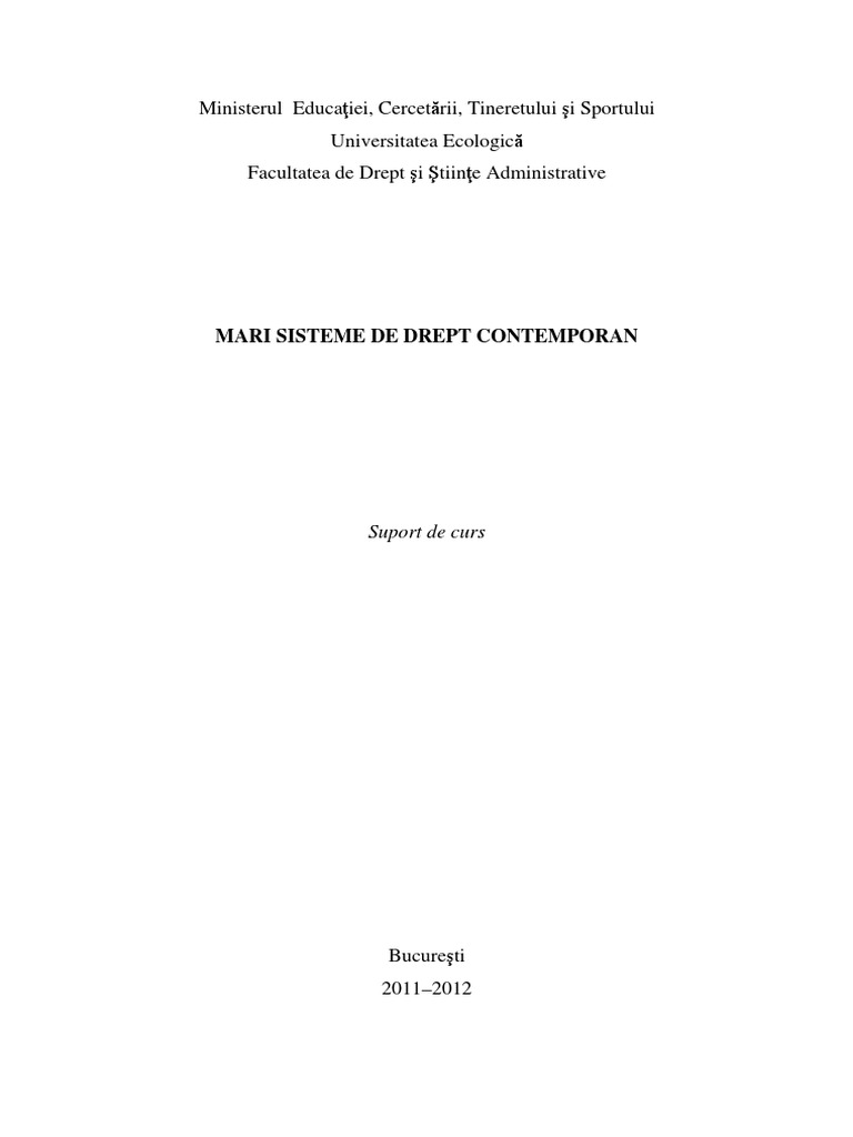 Acest curs intitulat Mari Sisteme de Drept Contemporan, reprezint o sintez a crilor Geografie juridic contemporan, Mari Sisteme de Drept n lumea contemporan, Drept privat comparat, Panorama marilor sisteme de drept al cror autor este Prof. univ. dr. Victor Dan Zltescu, membru titular al Academiei Internaionale de Drept Comparat, membru al Societii franceze de legislaie comparat, creatorul colii moderne de Drept Comparat din Romnia membru fondator, secretar general i apoi preedinte al Societii romne de drept comparat, judector la prima Curte Constituional i primul profesor titular de curs de drept comparat din Romnia. El a introdus, de altfel, dup 1990, Diciplina Drept comparat n nvmntul universitar din ara noastr dup 1990, prima universitate din Romnia n care s-a predat aceast materie de studiu este Universitatea Ecologic Bucureti. Cursul de fa, care este scris ntr-o manier sintetic i se adreseaz studenilor Universitii Ecologice Bucureti, Facultatea de Drept i tiine Administrative, Specializarea Drept, formele de nvmnt: frecvena redus (IFR) i nvmnt la distan (ID). Dup parcurgerea lui, studenii vor dobndi cunotinele necesare formrii unei viziuni complete asupra sistemului de drept n ansamblul su (drept comparat, sisteme juridice de drept). ngrijirea lucrrii de fa i actualizarea ei a fost efectuat de Prof. univ. dr. Irina Moroianu Zltescu, Drd. Adrian Bulgaru. Tehnoredactarea lucrrii: Petru Emanuel Zltescu
