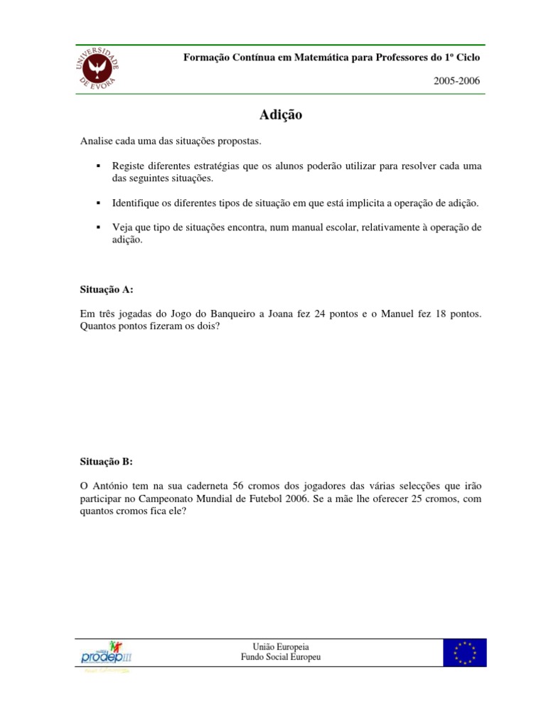 Veja que tipo de situações encontra, num manual escolar, relativamente à operação de adição. |