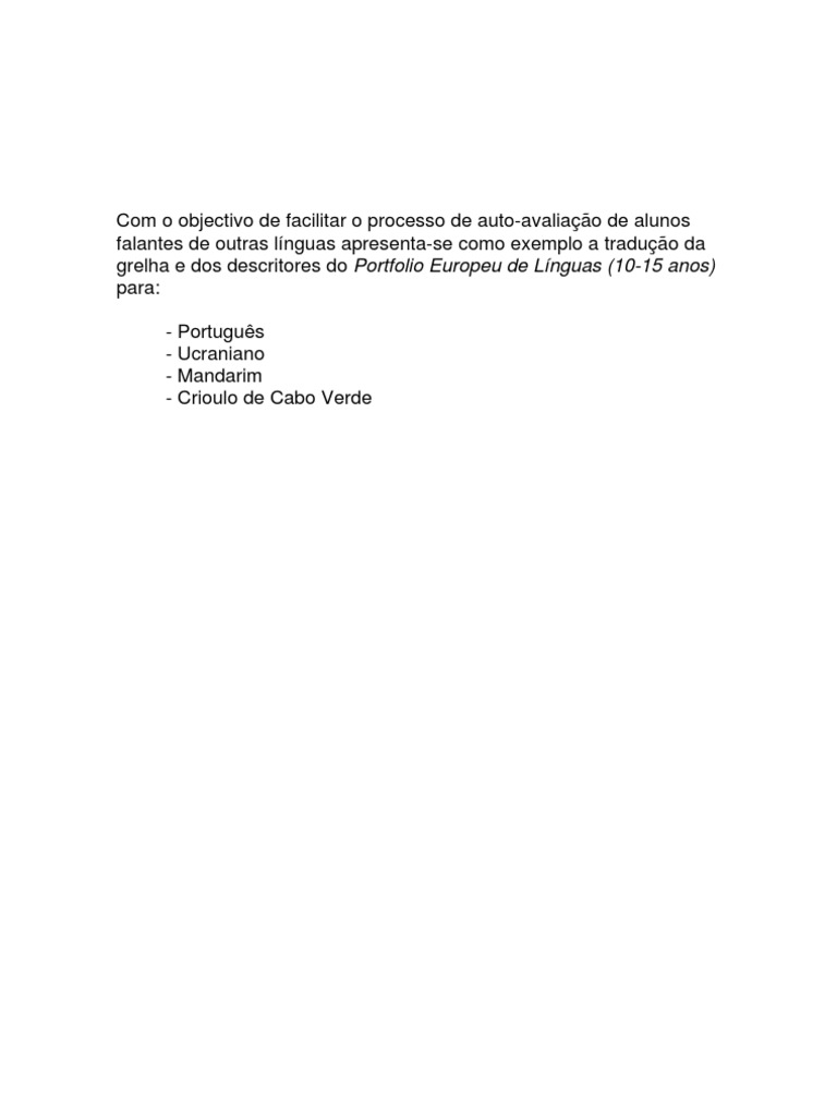 Com o objectivo de facilitar o processo de auto-avaliação de alunos falantes de outras línguas apresenta-se como exemplo a tradução da grelha e dos descritores do Portfolio Europeu de Línguas (10-15 anos) para: