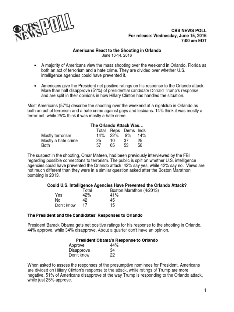 CBS NEWS POLL For release: Wednesday, June 15, 2016 7:00 am EDT Americans React to the Shooting in Orlando