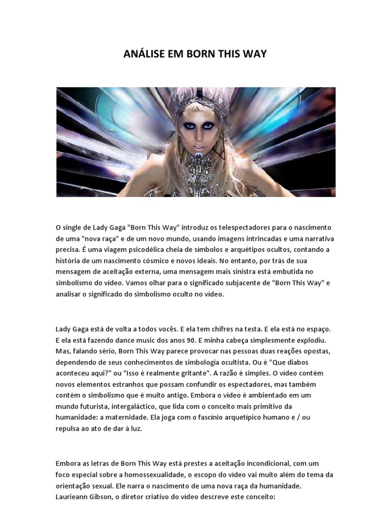Lady Gaga est de volta a todos vocs. E ela tem chifres na testa. E ela est no espao. E ela est fazendo dance music dos anos 90. E minha cabea simplesmente explodiu. Mas, falando srio, Born This Way parece provocar nas pessoas duas reaes opostas, dependendo de seus conhecimentos de simbologia ocultista. Ou "Que diabos aconteceu aqui?" ou "Isso realmente gritante". A razo simples. O vdeo contm novos elementos estranhos que possam confundir os espectadores, mas tambm contm o simbolismo que muito antigo. Embora o vdeo ambientado em um mundo futurista, intergalctico, que lida com o conceito mais primitivo da humanidade: a maternidade. Ela joga com o fascnio arquetpico humano e / ou repulsa ao ato de dar luz.