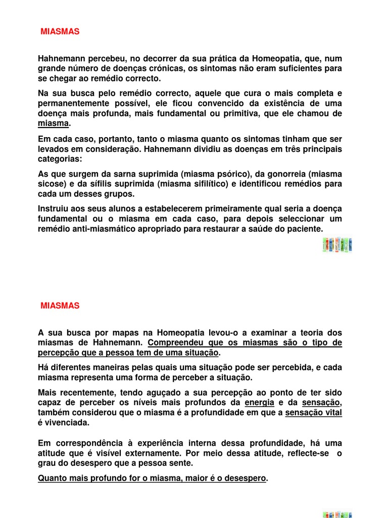 OS DEZ MIASMAS Uma pessoa ou um remdio pode ter mais de um miasma? Podemos comparar isso a uma mapa no qual uma localizao especfica pode ficar entre os dois lugares conhecidos. Por exemplo, o remdio Anacardium tem caractersticas do miasma do cncer e do miasma da lepra, e, portanto, parece ficar entre esses dois miasmas, sugerindo a existncia de outro miasma nessa rea. Portanto, um determinado estado pode ficar entre dois miasmas conhecidos, mas o miasma no pode mudar. Para citar novamente o exemplo do mapa, um local pode ficar apenas num ponto; ele no pode mudar ou mover-se. A ideia de haver mais de um miasma provavelmente vem do facto de que diferentes Matrias Mdicas descrevem imagens amplamente diferentes de cada remdio. Muitas imagens so baseadas em expresses e no em sentimentos internos ou iluses e sensaes. Se estudarmos os remdios tendo como foco as sensaes, a confuso cessa.