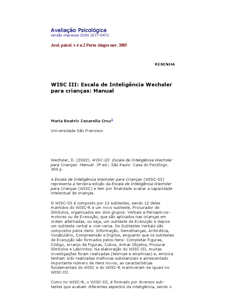 Wechsler, D. (2002). WISC-III: Escala de Inteligncia Wechsler para Crianas: Manual. 3 ed.; So Paulo: Casa do Psiclogo. 309 p. A Escala de Inteligncia Wechsler para Crianas (WISC-III) representa a terceira edio da Escala de Inteligncia Wechsler para Crianas (WISC) e tem por finalidade avaliar a capacidade intelectual de crianas. O WISC-III composto por 13 subtestes, sendo 12 deles mantidos do WISC-R e um novo subteste, Procurador de Smbolos, organizados em dois grupos: Verbais e Perceptivosmotores ou de Execuo, que so aplicados nas crianas em ordem alternadas, ou seja, um subteste de Execuo e depois um subteste verbal e vice-versa. Os Subtestes Verbais so compostos pelos itens: Informao, Semelhanas, Aritmtica, Vocabulrio, Compreenso e Dgitos, enquanto que os subtestes de Execuo so formados pelos itens: Completar Figuras, Cdigo, Arranjo de Figuras, Cubos, Armar Objetos, Procurar Smbolos e Labirintos. Na elaborao do WISC-III, muitas investigaes foram realizadas (tericas e empricas) e, embora tenham sido realizadas melhoras substanciais e acrescentado importante nmero de itens novos, as caractersticas fundamentais do WISC e do WISC-R mantiveram-se iguais no WISC-III. Como no WISC-R, o WISC-III, formado por diversos subtestes que avaliam diferentes aspectos da inteligncia, sendo o