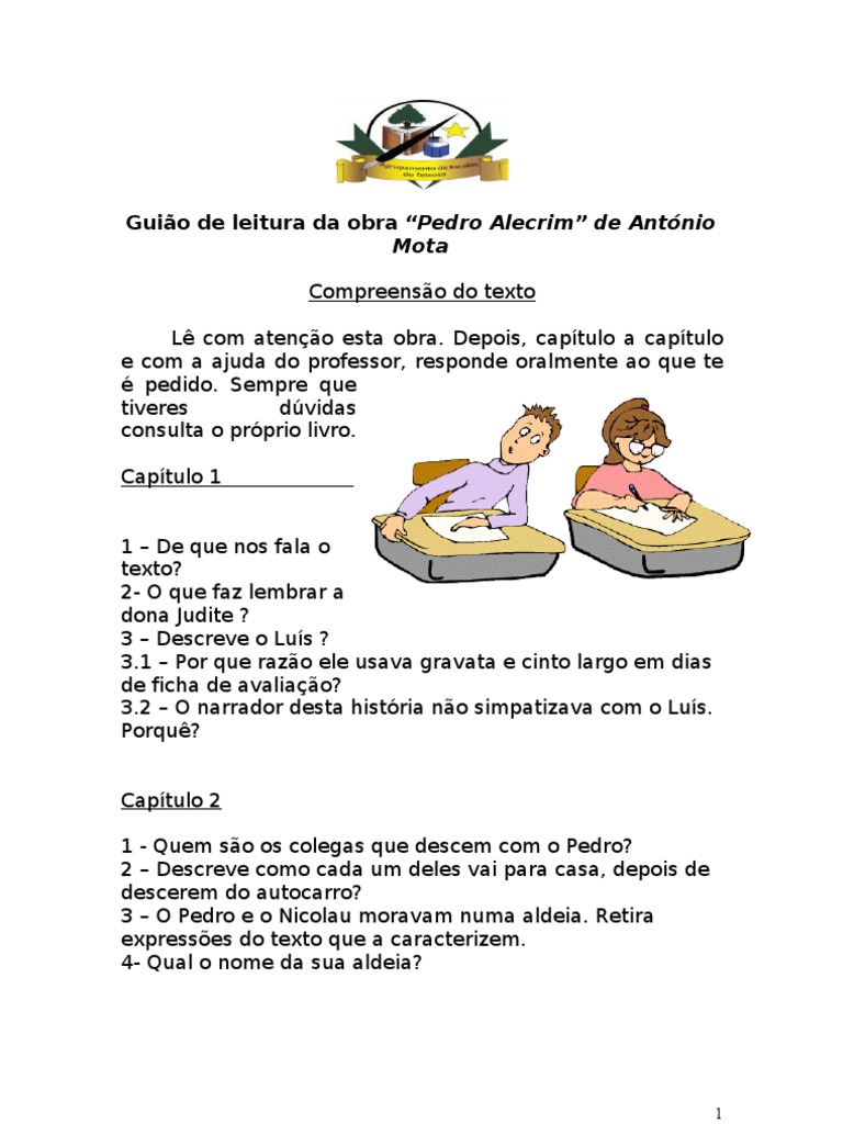 Depois, captulo a captulo e com a ajuda do professor, responde oralmente ao que te pedido. Sempre que tiveres dvidas consulta o prprio livro. Captulo 1 1 De que nos fala o texto? 2- O que faz lembrar a dona Judite ? 3 Descreve o Lus ? 3.1 Por que razo ele usava gravata e cinto largo em dias de ficha de avaliao? 3.2 O narrador desta histria no simpatizava com o Lus. Porqu? Captulo 2 1 - Quem so os colegas que descem com o Pedro? 2 Descreve como cada um deles vai para casa, depois de descerem do autocarro? 3 O Pedro e o Nicolau moravam numa aldeia. Retira expresses do texto que a caracterizem. 4- Qual o nome da sua aldeia?