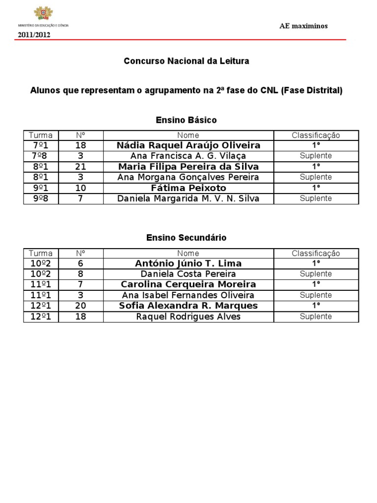 Concurso Nacional da Leitura Alunos que representam o agrupamento na 2 fase do CNL (Fase Distrital) Ensino Bsico