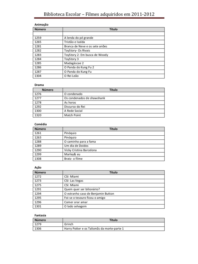 Animao Nmero 1259 1265 1281 1282 1283 1284 1285 1286 1287 1304 Drama Nmero 1276 1277 1278 1292 1300 1320 Comdia Nmero 1261 1263 1288 1289 1290 1299 1308 Ao Nmero 1272 1273 1275 1291 1294 1295 1296 1301 Fantasia Nmero 1279 1306 A lenda do p grande Tristo e Isolda Branca de Neve e os sete anes ToyStory- Os Rivais ToyStory 2- Em busca de Woody ToyStory 3 Madagscae 2 O Panda do Kung Fu 2 O Panda do Kung Fu O Rei Leo Ttulo