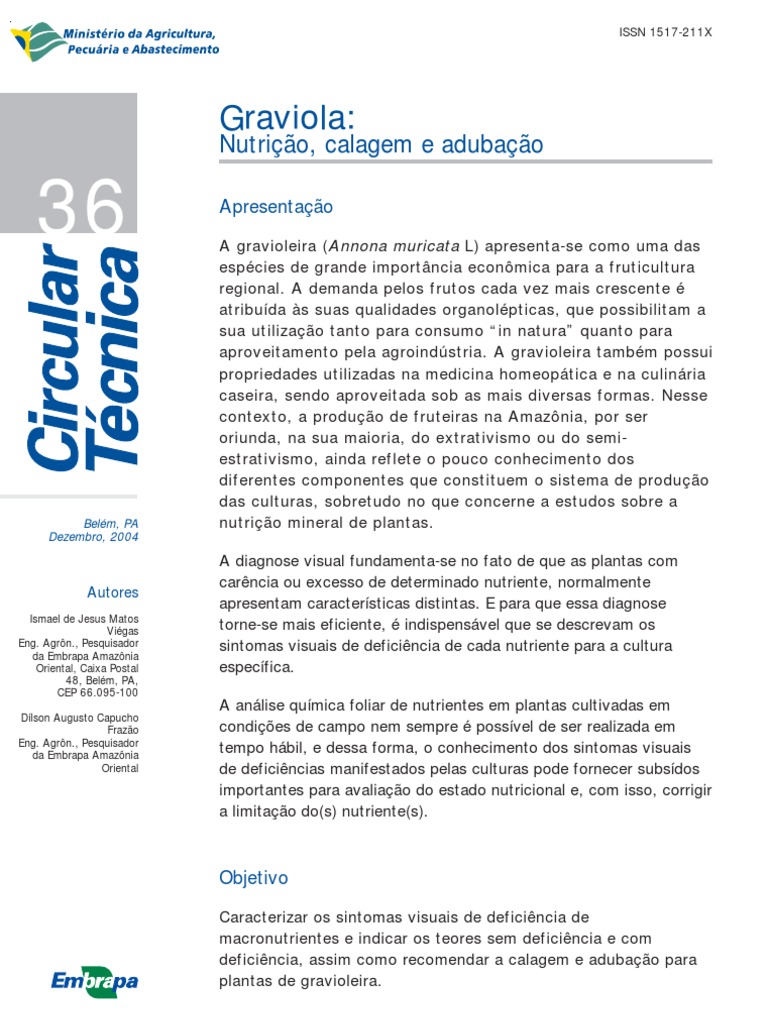 A gravioleira (Annona muricata L) apresenta-se como uma das espcies de grande importncia econmica para a fruticultura regional. A demanda pelos frutos cada vez mais crescente atribuda s suas qualidades organolpticas, que possibilitam a sua utilizao tanto para consumo in natura quanto para aproveitamento pela agroindstria. A gravioleira tambm possui propriedades utilizadas na medicina homeoptica e na culinria caseira, sendo aproveitada sob as mais diversas formas. Nesse contexto, a produo de fruteiras na Amaznia, por ser oriunda, na sua maioria, do extrativismo ou do semiestrativismo, ainda reflete o pouco conhecimento dos diferentes componentes que constituem o sistema de produo das culturas, sobretudo no que concerne a estudos sobre a nutrio mineral de plantas. A diagnose visual fundamenta-se no fato de que as plantas com carncia ou excesso de determinado nutriente, normalmente apresentam caractersticas distintas. E para que essa diagnose torne-se mais eficiente, indispensvel que se descrevam os sintomas visuais de deficincia de cada nutriente para a cultura especfica. A anlise qumica foliar de nutrientes em plantas cultivadas em condies de campo nem sempre possvel de ser realizada em tempo hbil, e dessa forma, o conhecimento dos sintomas visuais de deficincias manifestados pelas culturas pode fornecer subsdos importantes para avaliao do estado nutricional e, com isso, corrigir a limitao do(s) nutriente(s).