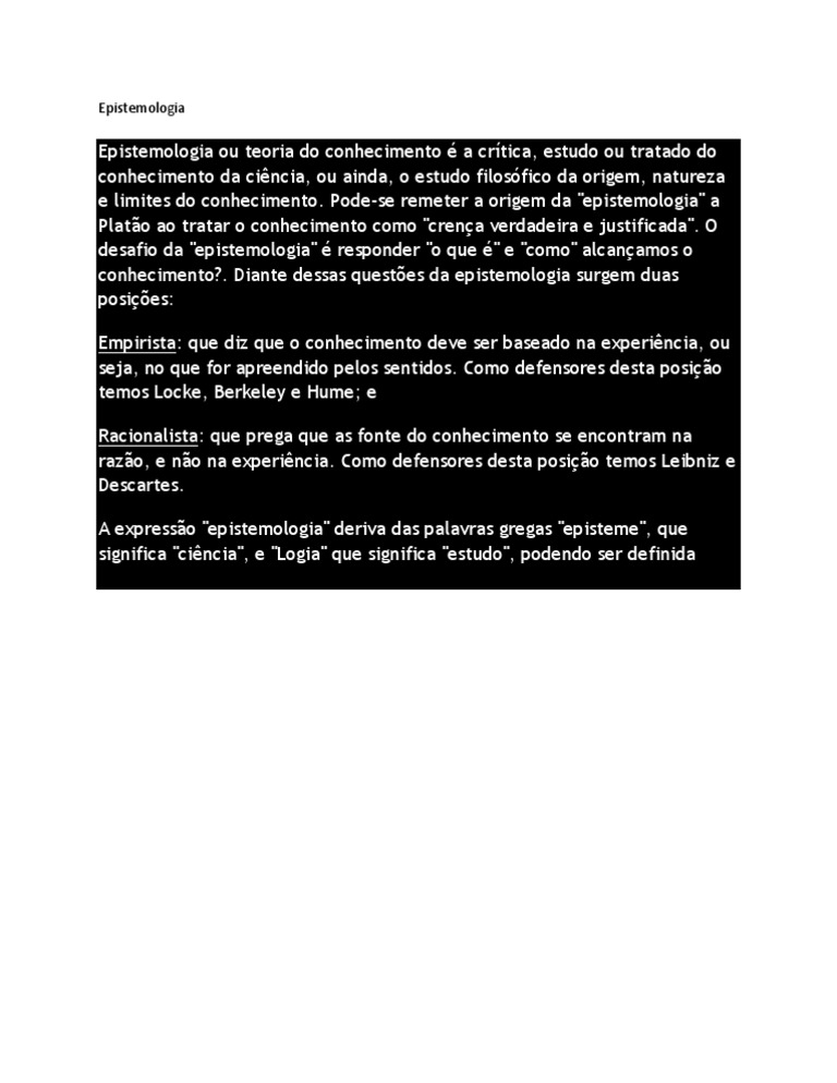 Epistemologia ou teoria do conhecimento a crtica, estudo ou tratado do conhecimento da cincia, ou ainda, o estudo filosfico da origem, natureza e limites do conhecimento. Pode-se remeter a origem da "epistemologia" a Plato ao tratar o conhecimento como "crena verdadeira e justificada". O desafio da "epistemologia" responder "o que " e "como" alcanamos o conhecimento?. Diante dessas questes da epistemologia surgem duas posies: Empirista: que diz que o conhecimento deve ser baseado na experincia, ou seja, no que for apreendido pelos sentidos. Como defensores desta posio temos Locke, Berkeley e Hume; e Racionalista: que prega que as fonte do conhecimento se encontram na razo, e no na experincia. Como defensores desta posio temos Leibniz e Descartes. A expresso "epistemologia" deriva das palavras gregas "episteme", que significa "cincia", e "Logia" que significa "estudo", podendo ser definida em sua etimologia como "o estudo da cincia".