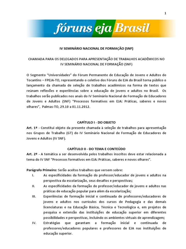 IV SEMINRIO NACIONAL DE FORMAO (SNF) CHAMADA PARA OS DELEGADOS PARA APRESENTAO DE TRABALHOS ACADMICOS NO IV SEMINRIO NACIONAL DE FORMAO (SNF) O Segmento Universidades do Frum Permanente de Educao de Jovens e Adultos do Tocantins FPEJA-TO, representando o coletivo dos Fruns de EJA do Brasil torna pblico o lanamento da chamada de seleo de trabalhos acadmicos na forma de textos que renam reflexes e experincias sobre a educao de jovens e adultos no Brasil. Os trabalhos sero publicados nos anais do IV Seminrio Nacional de Formao de Educadores de Jovens e Adultos (SNF) Processos formativos em EJA: Prticas, saberes e novos olhares, Palmas-TO, 29.10 a 01.11.2012.