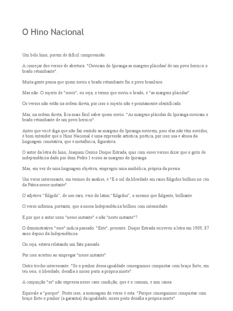 Um belo hino, porm de difcil compreenso. A comear dos versos de abertura: "Ouviram do Ipiranga as margens plcidas/ de um povo heroico o brado retumbante". Muita gente pensa que quem ouviu o brado retumbante foi o povo brasileiro. Mas no. O sujeito de "ouvir", ou seja, o termo que ouviu o brado, "as margens plcidas". Os versos no esto na ordem direta, por isso o sujeito no prontamente identificado. Mas, na ordem direta, fica mais fcil saber quem ouviu: "As margens plcidas do Ipiranga ouviram o brado retumbante de um povo heroico". Antes que voc diga que no faz sentido as margens do Ipiranga ouvirem, pois elas no tm ouvidos, bom entender que o Hino Nacional uma expresso artstica, potica, por isso usa e abusa da linguagem conotativa, que metafrica, figurativa. O autor da letra do hino, Joaquim Osrio Duque Estrada, quis com esses versos dizer que o grito de independncia dado por dom Pedro I ecoou s margens do Ipiranga. Mas, em vez de uma linguagem objetiva, empregou uma simblica, prpria da poesia. Um verso interessante, em termos de anlise, "E o sol da liberdade em raios flgidos brilhou no cu da Ptria nesse instante". O adjetivo flgido, de uso raro, veio do latim fulgidus, o mesmo que fulgente, brilhante. O verso informa, portanto, que a nossa Independncia brilhou com intensidade. E por que o autor usou "nesse instante" e no "neste instante"? O demonstrativo "esse" indica passado. "Este", presente. Duque Estrada escreveu a letra em 1909, 87 anos depois da Independncia. Ou seja, estava relatando um fato passado. Por isso acertou ao empregar "nesse instante". Outro trecho interessante: "Se o penhor dessa igualdade conseguimos conquistar com brao forte, em teu seio, liberdade, desafia o nosso peito a prpria morte". A conjuno "se" no expressa nesse caso condio, que o comum, e sim causa. Equivale a porque". Posto isso, a mensagem do verso esta: "Porque conseguimos conquistar com brao forte o penhor (a garantia) da igualdade, nosso peito desafia a prpria morte".