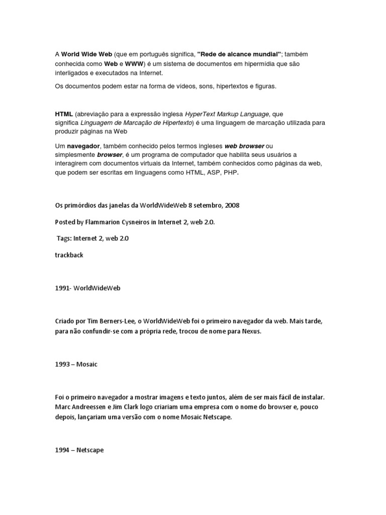 Os primrdios das janelas da WorldWideWeb 8 setembro, 2008 Posted by Flammarion Cysneiros in Internet 2, web 2.0. Tags: Internet 2, web 2.0 trackback