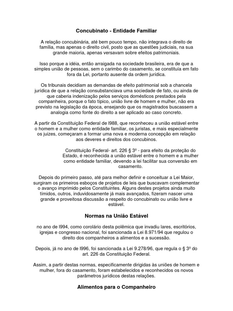 A relao concubinria, at bem pouco tempo, no integrava o direito de famlia, mas apenas o direito civil, posto que as questes judiciais, na sua grande maioria, apenas versavam sobre efeitos patrimoniais. Isso porque a idia, ento arraigada na sociedade brasileira, era de que a simples unio de pessoas, sem o carimbo do casamento, se constitua em fato fora da Lei, portanto ausente da ordem jurdica. Os tribunais decidiam as demandas de efeito patrimonial sob a chancela jurdica de que a relao consubstanciava uma sociedade de fato, ou ainda de que caberia indenizao pelos servios domsticos prestados pela companheira, porque o fato tpico, unio livre de homem e mulher, no era previsto na legislao da poca, ensejando que os magistrados buscassem a analogia como fonte do direito a ser aplicado ao caso concreto. A partir da Constituio Federal de l988, que reconheceu a unio estvel entre o homem e a mulher como entidade familiar, os juristas, e mais especialmente os juizes, comearam a formar uma nova e moderna concepo em relao aos deveres e direitos dos concubinos. Constituio Federal- art. 226 3 - para efeito da proteo do Estado, reconhecida a unio estvel entre o homem e a mulher como entidade familiar, devendo a lei facilitar sua converso em casamento. Depois do primeiro passo, at para melhor definir e conceituar a Lei Maior, surgiram os primeiros esboos de projetos de leis que buscavam complementar o avano imprimido pelos Constituintes. Alguns destes projetos ainda muito tmidos, outros, induvidosamente j mais avanados, fizeram nascer uma grande e proveitosa discusso a respeito do concubinato ou unio livre e estvel.