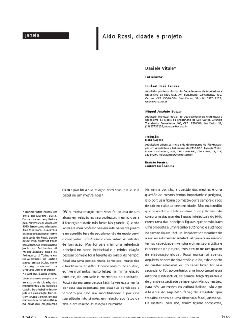 construir racionalmente a arquitetura, por outro um caminho totalmente pessoal em direo arquitetura. risco De que maneira o livro A Arquitetura da Cidade de Rossi se transformou em referencia para o pensamento e o debate arquitetnicos? DV A Arquitetura da Cidade foi um livro muito importante, por certos aspectos improvisado e era um livro contraditrio. mais uma colagem que um livro unitrio, um conjunto de textos e de trechos construdos no tempo, escritos s vezes com grande intensidade potica. Mas eu penso que no seja um livro que tenha densidade, um livro que rene muitas idias diferentes, muitas observaes e muitos estudos diferentes, mas eu acredito que seu valor consista nisso: primeiramente em uma capacidade de um olhar muito amplo sobre as questes da cidade. Rossi conhecia a fundo os textos da literatura europia, da sociologia, da economia urbana, da geografia, da historia e faz um uso deles muito tendencioso e deformado. O seu objetivo aquele de fazer referncia a um saber muito articulado, muito complexo e muito diferenciado arquitetura. Mas a sua obsesso, o seu problema, aquele de construir um texto de arquitetura. um texto que no entra no mrito das escolhas projetuais e das escolhas formais, mas um texto que v a cidade como o terreno de uma fundao possvel da arquitetura. Deve ser pensado em relao ao momento histrico e esse momento histrico era um momento de crise, de abandono das teses e de ausncia de confiana nas teses tradicionais do movimento moderno, no funcionalismo e tambm na sua teoria com relao cidade. Na realidade Rossi retoma um caminho antigo, que aquele de pr a cidade como referncia primeira e de fundao em relao arquitetura, talvez seguindo a lio do tratado de Alberti e de tantos outros tratados. Mas sempre existiram alternativas idia da arquitetura como construo, da arquitetura que se apoiava em fundamentos externos, em iluses sociais ou em fundamentos sociolgicos. Rossi pensa que a possibilidade seja aquela de relacionar a arquitetura cidade e v a cidade como a base terica possvel da nova arquitetura. Ele no diz exatamente como isso seja possvel, mas no livro goteja como um equvoco possvel e um equivoco de tipo positivista. Rossi cita sempre quais eram os