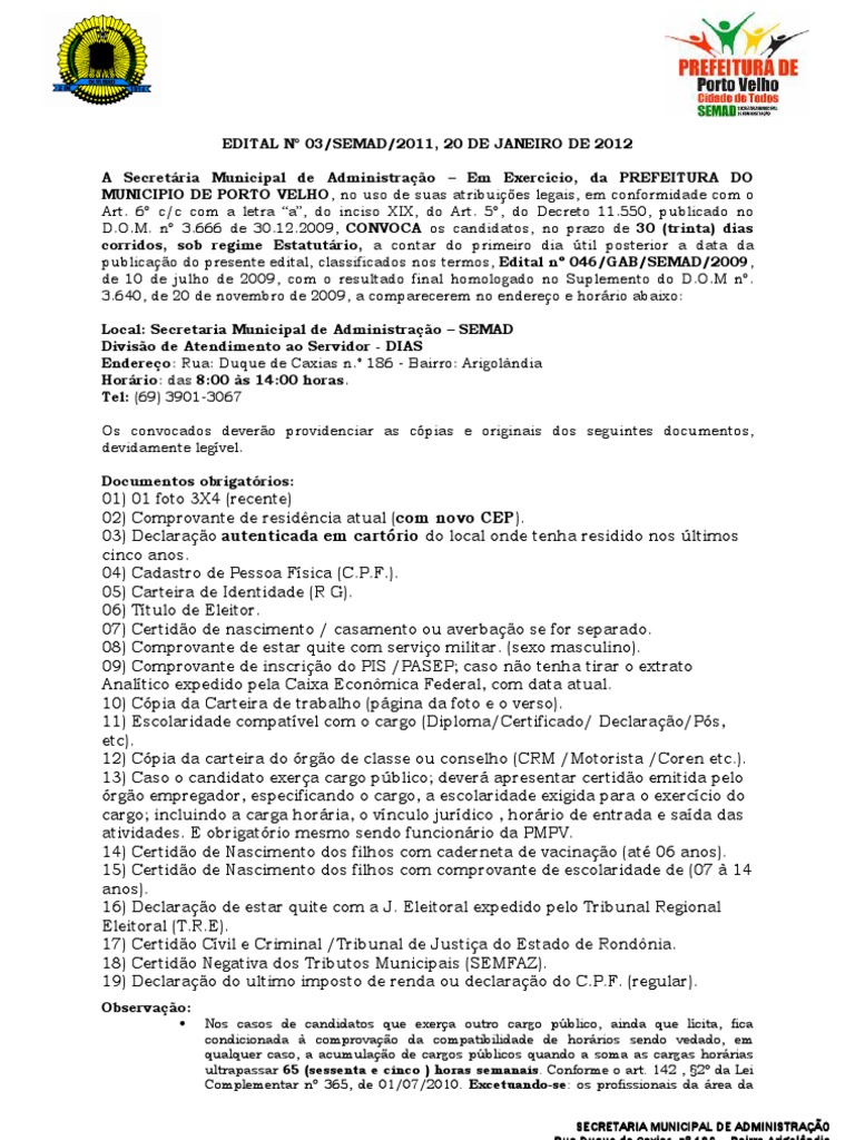 s legais, em conformidade com o Art. 6 c/c com a letra a, do inciso XIX, do Art. 5, do Decreto 11.550, publicado no D.O.M. n 3.666 de 30.12.2009, CONVOCA os candidatos, no prazo de 30 (trinta) dias corridos, sob regime Estatutrio, a contar do primeiro dia til posterior a data da publicao do presente edital, classificados nos termos, Edital n 046/GAB/SEMAD/2009, de 10 de julho de 2009, com o resultado final homologado no Suplemento do D.O.M n. 3.640, de 20 de novembro de 2009, a comparecerem no endereo e horrio abaixo: Local: Secretaria Municipal de Administrao SEMAD Diviso de Atendimento ao Servidor - DIAS Endereo: Rua: Duque de Caxias n. 186 - Bairro: Arigolndia Horrio: das 8:00 s 14:00 horas. Tel: (69) 3901-3067 Os convocados devero providenciar as cpias e originais dos seguintes documentos, devidamente legvel. Documentos obrigatrios: