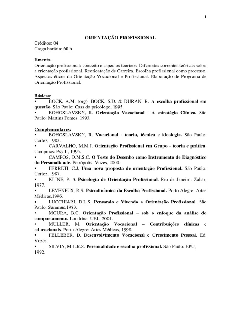 ORIENTAO PROFISSIONAL Crditos: 04 Carga horria: 60 h Ementa Orientao profissional: conceito e aspectos tericos. Diferentes correntes tericas sobre a orientao profissional. Reorientao de Carreira. Escolha profissional como processo. Aspectos ticos da Orientao Vocacional e Profissional. Elaborao de Programa de Orientao Profissional. Bsicas: BOCK, A.M. (org); BOCK, S.D. & DURAN, R. A escolha profissional em questo. So Paulo: Casa do psiclogo, 1995. BOHOSLAVSKY, R. Orientao Vocacional - A estratgia Clnica. So Paulo: Martins Fontes, 1993. Complementares: BOHOSLAVSKY, R. Vocacional - teoria, tcnica e ideologia. So Paulo: Cortez, 1983. CARVALHO, M.M.J. Orientao Profissional em Grupo - teoria e prtica. Campinas: Psy II, 1995. CAMPOS, D.M.S.C. O Teste do Desenho como Instrumento de Diagnstico da Personalidade. Petrpolis: Vozes, 2000. FERRETI, C.J. Uma nova proposta de orientao Profissional. So Paulo: Cortez, 1987. KLINE, P. A Psicologia de Orientao Profissional. Rio de Janeiro: Zahar, 1977. LEVENFUS, R.S. Psicodinmica da Escolha Profissional. Porto Alegre: Artes Mdicas,1996. LUCCHIARI, D.L.S. Pensando e Vivendo a Orientao Profissional. So Paulo: Summus,1983. MOURA, B.C. Orientao Profissional sob o enfoque da anlise do comportamento. Londrina: UEL, 2001. MULLER, M. Orientao Vocacional Contribuies clnicas e educacionais. Porto Alegre: Artes Mdicas, 1998. PELLEBER, D. Desenvolvimento Vocacional e Crescimento Pessoal. Ed. Vozes. SILVIA, M.L.R.S. Personalidade e escolha profissional. So Paulo: EPU, 1992.