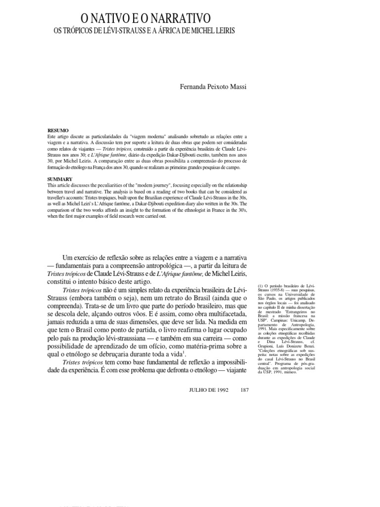 Palavras-chave: Antropologia; viagem moderna; relato de viagem; Lvi-Strauss; Michel Leiris; pesquisa de campo. Keywords: Anthropology, modern Journey, traveller's account; Lvi-Strauss; Michel Leiris; field research.