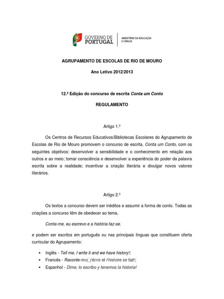 Artigo 1. Os Centros de Recursos Educativos/Bibliotecas Escolares do Agrupamento de Escolas de Rio de Mouro promovem o concurso de escrita, Conta um Conto, com os seguintes objetivos: desenvolver a sensibilidade e o conhecimento em relao aos outros e ao meio; tomar conscincia e desenvolver a experincia do poder da palavra escrita sobre a realidade; incentivar a criao literria e divulgar novos valores literrios.