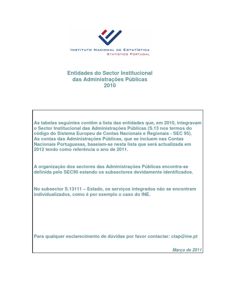 As tabelas seguintes contm a lista das entidades que, em 2010, integravam o Sector Institucional das Administraes Pblicas (S.13 nos termos do cdigo do Sistema Europeu de Contas Nacionais e Regionais - SEC 95). As contas das Administraes Pblicas, que se incluem nas Contas Nacionais Portuguesas, baseiam-se nesta lista que ser actualizada em 2012 tendo como referncia o ano de 2011.
