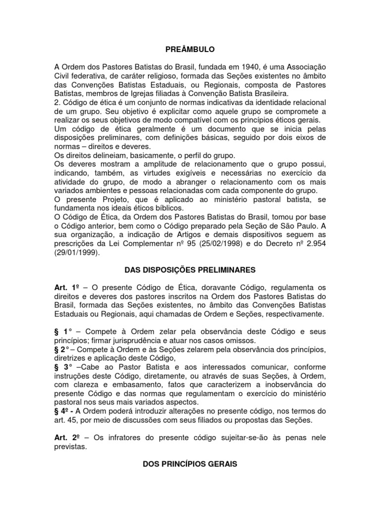 Art. 1º – O presente Código de Ética, doravante Código, regulamenta os direitos e deveres dos pastores inscritos na Ordem dos Pastores Batistas do Brasil, formada das Seções existentes, no âmbito das Convenções Batistas Estaduais ou Regionais, aqui chamadas de Ordem e Seções, respectivamente.