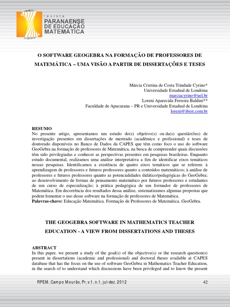 voltada para o desenvolvimento humano. Um dos softwares em evidência no âmbito da Educação Matemática é o GeoGebra 2 , pois é um software livre que permite realizar atividades de geometria, álgebra, números e estatística em qualquer nível ou modalidade de ensino, e possui uma interface de fácil acesso que não requer conhecimentos prévios de informática. Atualmente existem vários Institutos GeoGebra no mundo que, por meio de sites, disponibilizam tutoriais, fóruns, vídeos e construções que ajudam na compreensão de suas ferramentas e de conceitos matemáticos, auxiliando a sua inserção nas práticas pedagógicas e também nas pesquisas. Dessa forma, estudamos o(s) objetivo(s) e a(s) questão(ões) de investigação de dissertações de mestrado (profissional e acadêmico) e teses de doutorado brasileiras que trataram do uso do software GeoGebra na formação de professores de Matemática, na busca de compreender quais discussões têm sido privilegiadas e conhecer as perspectivas presentes nessas pesquisas.