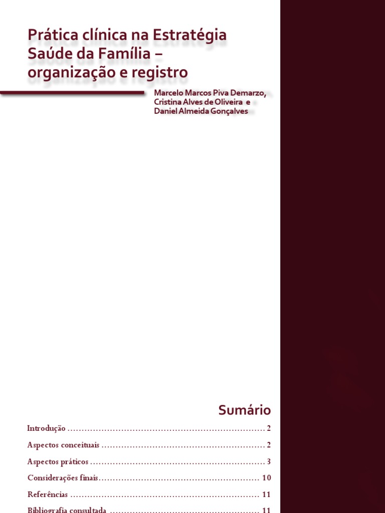 ATHAYDE, E S; GIL, C R R Possibilidades do uso do genograma no trabalho cotidiano dos mdicos das Equipes de Sade da Famlia de Londrina Revista Espao para a Sade, v 6, 2, p 13-22, 2005 BRASIL Ministrio da Sade Grupo Hospitalar Conceio Manual de assistncia domiciliar na Ateno Primria Sade. Porto Alegre: Ministrio da Sade, 2003 CANTALE, C R Histria Clinica Orientada a Problemas. Sl : University of Southern California, 2003, p 7 OLIVEIRA, F B; BERGER, C B Visitas domiciliares em APS: equidade e qualificao dos servios Mom & Perpect Sade, v 9, n 2, p 69-74, 1996 PEREIRA et al O uso do pronturio familiar como indicador de qualidade da ateno nas Unidades Bsicas De Sade Cadernos de Sade Pblica, v 24, Suplemento 1, p S123-S133, 2008 RAKEL, R E Tratado de Medicina de Famlia. Sl: Editora Guanabara Koogan, 1995 RAMOS, V A Consulta em 7 Passos. Lisboa: VFBM Comunicao Ltda, 2008, p 126 ROMAN, A C Informatizao do registro clnico essencial para a Ateno Primria Sade: um instrumento de apoio s equipes da Estratgia Sade da Famlia. 102 p So Paulo, 2009 Tese (Doutorado em Patologia) Universidade de So Paulo, USP STANGE, K C et al Defining and Measuring the Patient-Centered Medical Home J Gen Intern Med., v 25, n 6, p 601-612, 2010 STEWART, M et al Medicina centrada na pessoa: transformando o mtodo clnico Porto Alegre: Artmed, 2010 WONCA (World Organization of National Colleges, Academies, and Academic Associations of General Practitioners/ Family Physicians) Classificao Internacional de Ateno Primria (CIAP 2) Sl: Sociedade Brasileira de Medicina de Famlia e Comunidade (SBMFC), 2009, p 200