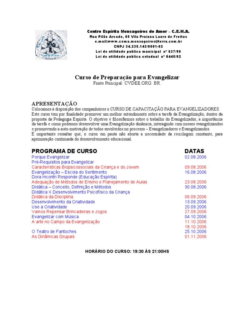 Colocamos disposio dos companheiros o CURSO DE CAPACITAO PARA EVANGELIZADORES. Este curso tem por finalidade promover um melhor entendimento sobre a tarefa da Evangelizao, dentro da proposta da Pedagogia Esprita. O objetivo filosofarmos sobre o trabalho do Evangelizador, a importncia da tarefa e como podemos desenvolver uma Evangelizao dinmica, interagindo com nossos evangelizandos e promovendo a auto-motivao de todos envolvidos no processo Evangelizadores e Evangelizandos. importante ressaltar que, o curso em pauta no aborta a necessidade da reciclagem constante, para aprimorao continuada do desenvolvimento educacional.