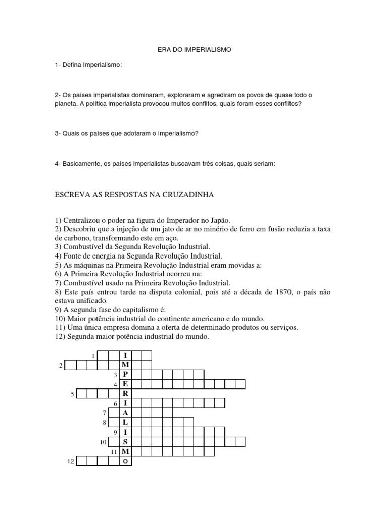 ESCREVA AS RESPOSTAS NA CRUZADINHA 1) Centralizou o poder na figura do Imperador no Japo. 2) Descobriu que a injeo de um jato de ar no minrio de ferro em fuso reduzia a taxa de carbono, transformando este em ao. 3) Combustvel da Segunda Revoluo Industrial. 4) Fonte de energia na Segunda Revoluo Industrial. 5) As mquinas na Primeira Revoluo Industrial eram movidas a: 6) A Primeira Revoluo Industrial ocorreu na: 7) Combustvel usado na Primeira Revoluo Industrial. 8) Este pas entrou tarde na disputa colonial, pois at a dcada de 1870, o pas no estava unificado. 9) A segunda fase do capitalismo : 10) Maior potncia industrial do continente americano e do mundo. 11) Uma nica empresa domina a oferta de determinado produtos ou servios. 12) Segunda maior potncia industrial do mundo.