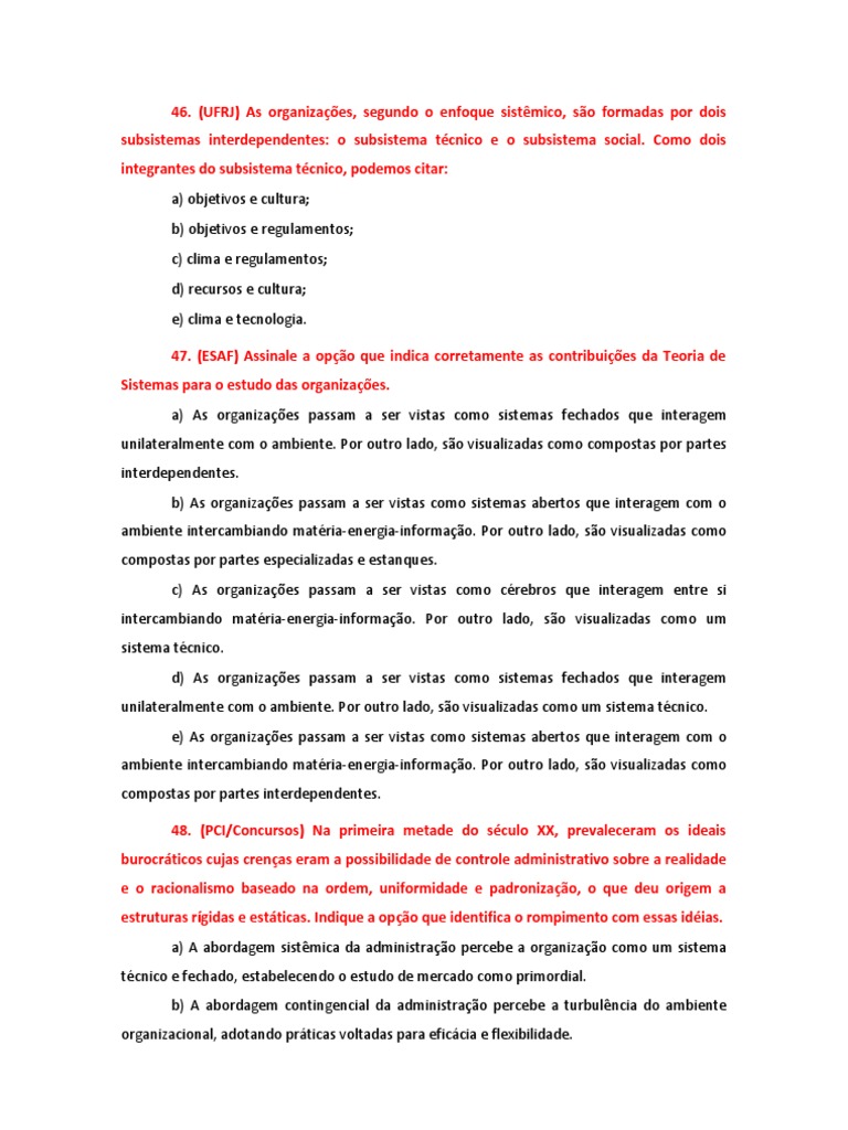 Como dois integrantes do subsistema tcnico, podemos citar: a) objetivos e cultura; b) objetivos e regulamentos; c) clima e regulamentos; d) recursos e cultura; e) clima e tecnologia. 47. (ESAF) Assinale a opo que indica corretamente as contribuies da Teoria de Sistemas para o estudo das organizaes. a) As organizaes passam a ser vistas como sistemas fechados que interagem unilateralmente com o ambiente. Por outro lado, so visualizadas como compostas por partes interdependentes. b) As organizaes passam a ser vistas como sistemas abertos que interagem com o ambiente intercambiando matria-energia-informao. Por outro lado, so visualizadas como compostas por partes especializadas e estanques. c) As organizaes passam a ser vistas como crebros que interagem entre si intercambiando matria-energia-informao. Por outro lado, so visualizadas como um sistema tcnico. d) As organizaes passam a ser vistas como sistemas fechados que interagem unilateralmente com o ambiente. Por outro lado, so visualizadas como um sistema tcnico. e) As organizaes passam a ser vistas como sistemas abertos que interagem com o ambiente intercambiando matria-energia-informao. Por outro lado, so visualizadas como compostas por partes interdependentes. 48. (PCI/Concursos) Na primeira metade do sculo XX, prevaleceram os ideais burocrticos cujas crenas eram a possibilidade de controle administrativo sobre a realidade e o racionalismo baseado na ordem, uniformidade e padronizao, o que deu origem a estruturas rgidas e estticas. Indique a opo que identifica o rompimento com essas idias. a) A abordagem sistmica da administrao percebe a organizao como um sistema tcnico e fechado, estabelecendo o estudo de mercado como primordial. b) A abordagem contingencial da administrao percebe a turbulncia do ambiente organizacional, adotando prticas voltadas para eficcia e flexibilidade.