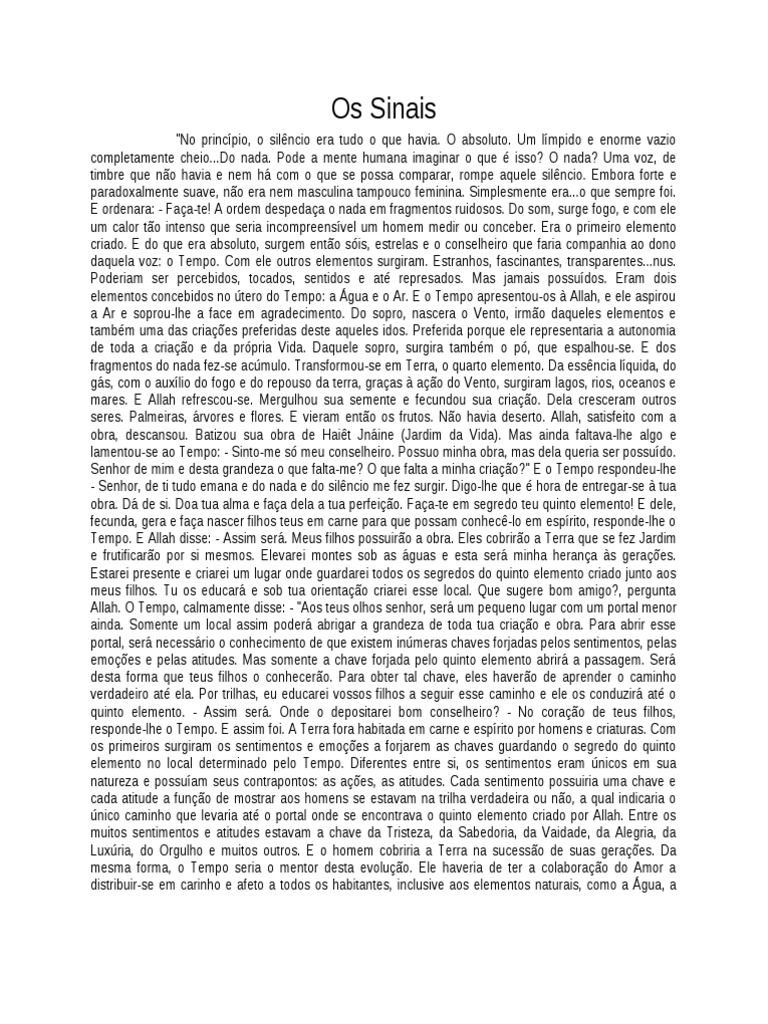 "No princpio, o silncio era tudo o que havia. O absoluto. Um lmpido e enorme vazio completamente cheio...Do nada. Pode a mente humana imaginar o que isso? O nada? Uma voz, de timbre que no havia e nem h com o que se possa comparar, rompe aquele silncio. Embora forte e paradoxalmente suave, no era nem masculina tampouco feminina. Simplesmente era...o que sempre foi. E ordenara: - Faa-te! A ordem despedaa o nada em fragmentos ruidosos. Do som, surge fogo, e com ele um calor to intenso que seria incompreensvel um homem medir ou conceber. Era o primeiro elemento criado. E do que era absoluto, surgem ento sis, estrelas e o conselheiro que faria companhia ao dono daquela voz: o Tempo. Com ele outros elementos surgiram. Estranhos, fascinantes, transparentes...nus. Poderiam ser percebidos, tocados, sentidos e at represados. Mas jamais possudos. Eram dois elementos concebidos no tero do Tempo: a gua e o Ar. E o Tempo apresentou-os Allah, e ele aspirou a Ar e soprou-lhe a face em agradecimento. Do sopro, nascera o Vento, irmo daqueles elementos e tambm uma das criaes preferidas deste aqueles idos. Preferida porque ele representaria a autonomia de toda a criao e da prpria Vida. Daquele sopro, surgira tambm o p, que espalhou-se. E dos fragmentos do nada fez-se acmulo. Transformou-se em Terra, o quarto elemento. Da essncia lquida, do gs, com o auxlio do fogo e do repouso da terra, graas ao do Vento, surgiram lagos, rios, oceanos e mares. E Allah refrescou-se. Mergulhou sua semente e fecundou sua criao. Dela cresceram outros seres. Palmeiras, rvores e flores. E vieram ento os frutos. No havia deserto. Allah, satisfeito com a obra, descansou. Batizou sua obra de Hait Jnine (Jardim da Vida). Mas ainda faltava-lhe algo e lamentou-se ao Tempo: - Sinto-me s meu conselheiro. Possuo minha obra, mas dela queria ser possudo. Senhor de mim e desta grandeza o que falta-me? O que falta a minha criao?" E o Tempo respondeu-lhe - Senhor, de ti tudo emana e do nada e do silncio me fez surgir. Digo-lhe que hora de entregar-se tua obra. D de si. Doa tua alma e faa dela a tua perfeio. Faa-te em segredo teu quinto elemento! E dele, fecunda, gera e faa nascer filhos teus em carne para que possam conhec-lo em esprito, responde-lhe o Tempo. E Allah disse: - Assim ser. Meus filhos possuiro a obra. Eles cobriro a Terra que se fez Jardim e frutificaro por si mesmos. Elevarei montes sob as guas e esta ser minha herana s geraes. Estarei presente e criarei um lugar onde guardarei todos os segredos do quinto elemento criado junto aos meus filhos. Tu os educar e sob tua orientao criarei esse local. Que sugere bom amigo?, pergunta Allah. O Tempo, calmamente disse: - "Aos teus olhos senhor, ser um pequeno lugar com um portal menor ainda. Somente um local assim poder abrigar a grandeza de toda tua criao e obra. Para abrir esse portal, ser necessrio o conhecimento de que existem inmeras chaves forjadas pelos sentimentos, pelas emoes e pelas atitudes. Mas somente a chave forjada pelo quinto elemento abrir a passagem. Ser desta forma que teus filhos o conhecero. Para obter tal chave, eles havero de aprender o caminho verdadeiro at ela. Por trilhas, eu educarei vossos filhos a seguir esse caminho e ele os conduzir at o quinto elemento. - Assim ser. Onde o depositarei bom conselheiro? - No corao de teus filhos, responde-lhe o Tempo. E assim foi. A Terra fora habitada em carne e esprito por homens e criaturas. Com os primeiros surgiram os sentimentos e emoes a forjarem as chaves guardando o segredo do quinto elemento no local determinado pelo Tempo. Diferentes entre si, os sentimentos eram nicos em sua natureza e possuam seus contrapontos: as aes, as atitudes. Cada sentimento possuiria uma chave e cada atitude a funo de mostrar aos homens se estavam na trilha verdadeira ou no, a qual indicaria o nico caminho que levaria at o portal onde se encontrava o quinto elemento criado por Allah. Entre os muitos sentimentos e atitudes estavam a chave da Tristeza, da Sabedoria, da Vaidade, da Alegria, da Luxria, do Orgulho e muitos outros. E o homem cobriria a Terra na sucesso de suas geraes. Da mesma forma, o Tempo seria o mentor desta evoluo. Ele haveria de ter a colaborao do Amor a distribuir-se em carinho e afeto a todos os habitantes, inclusive aos elementos naturais, como a gua, a