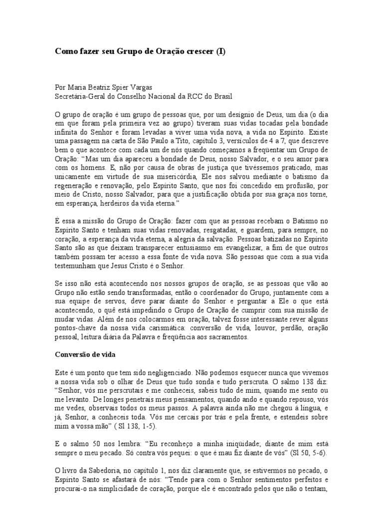 Por Maria Beatriz Spier Vargas Secretria-Geral do Conselho Nacional da RCC do Brasil O grupo de orao um grupo de pessoas que, por um desgnio de Deus, um dia (o dia em que foram pela primeira vez ao grupo) tiveram suas vidas tocadas pela bondade infinita do Senhor e foram levadas a viver uma vida nova, a vida no Esprito. Existe uma passagem na carta de So Paulo a Tito, captulo 3, versculos de 4 a 7, que descreve bem o que acontece com cada um de ns quando comeamos a freqentar um Grupo de Orao: Mas um dia apareceu a bondade de Deus, nosso Salvador, e o seu amor para com os homens. E, no por causa de obras de justia que tivssemos praticado, mas unicamente em virtude de sua misericrdia, Ele nos salvou mediante o batismo da regenerao e renovao, pelo Esprito Santo, que nos foi concedido em profuso, por meio de Cristo, nosso Salvador, para que a justificao obtida por sua graa nos torne, em esperana, herdeiros da vida eterna. essa a misso do Grupo de Orao: fazer com que as pessoas recebam o Batismo no Esprito Santo e tenham suas vidas renovadas, resgatadas, e guardem, para sempre, no corao, a esperana da vida eterna, a alegria da salvao. Pessoas batizadas no Esprito Santo so as que deixam transparecer entusiasmo em evangelizar, a fim de que outros tambm possam ter acesso a essa fonte de vida nova. So pessoas que com a sua vida testemunham que Jesus Cristo o Senhor. Se isso no est acontecendo nos nossos grupos de orao, se as pessoas que vo ao Grupo no esto sendo transformadas, ento o coordenador do Grupo, juntamente com a sua equipe de servos, deve parar diante do Senhor e perguntar a Ele o que est acontecendo, o qu est impedindo o Grupo de Orao de cumprir com sua misso de mudar vidas. Alm de nos colocarmos em orao, talvez fosse interessante rever alguns pontos-chave da nossa vida carismtica: converso de vida, louvor, perdo, orao pessoal, leitura diria da Palavra e freqncia aos sacramentos. Converso de vida Este um ponto que tem sido negligenciado. No podemos esquecer nunca que vivemos a nossa vida sob o olhar de Deus que tudo sonda e tudo perscruta. O salmo 138 diz: Senhor, vs me perscrutais e me conheceis, sabeis tudo de mim, quando me sento ou me levanto. De longes penetrais meus pensamentos, quando ando e quando repouso, vs me vedes, observais todos os meus passos. A palavra ainda no me chegou lngua, e j, Senhor, a conheceis toda. Vs me cercais por trs e pela frente, e estendeis sobre mim a vossa mo ( Sl 138, 1-5). E o salmo 50 nos lembra: Eu reconheo a minha iniqidade; diante de mim est sempre o meu pecado. S contra vs pequei: o que mau fiz diante de vs (Sl 50, 5-6). O livro da Sabedoria, no captulo 1, nos diz claramente que, se estivermos no pecado, o Esprito Santo se afastar de ns: Tende para com o Senhor sentimentos perfeitos e procurai-o na simplicidade de corao, porque ele encontrado pelos que no o tentam,