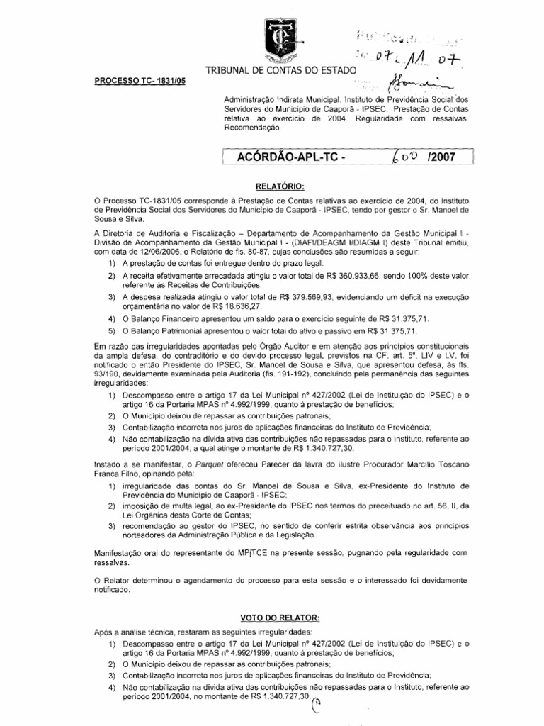 1) julgamento regular com ressalvas da presente prestação de contas de responsabilidade do Sr. Manoel de Sousa e Silva, na qualidade de gestor do Instituto de Previdência Social dos Servidores do Município de Caaporã - IPSEC, relativamente ao exercicio de 2004;