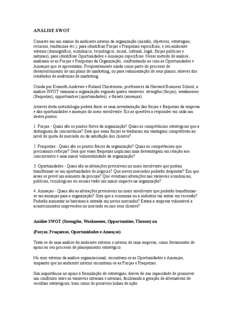 Consiste em um exame do ambiente interno da organizao (misso, objetivos, estratgias, recursos, tendncias etc.), para identificar Foras e Fraquezas especficas, e seu ambiente externo (demogrfico, econmico, tecnolgico, social, cultural, legal, foras polticas e naturais), para identificar Oportunidades e Ameaas especficas. Nesse mtodo de anlise, analisam-se as Foras e Fraquezas da Organizao, confrontando-as com as Oportunidades e Ameaas que se apresentam. Freqentemente usada como parte do processo de desenvolvimento de um plano de marketing, ou para realimentao de seus planos, atravs dos resultados de auditorias de marketing. Criada por Kenneth Andrews e Roland Christensen, professores da Harvard Business School, a anlise SWOT examina a organizao segundo quatro variveis: strengths (foras); weaknesses (fraquezas); opportunities (oportunidades); e threats (ameaas). Atravs desta metodologia poder fazer-se uma inventariao das foras e fraquezas da empresa e das oportunidades e ameaas do meio envolvente. Eis as questes a responder em cada um destes pontos. 1. Foras - Quais so os pontos fortes da organizao? Quais as competncias estratgicas que a distinguem da concorrncia? Ser que essas foras se traduzem em vantagens competitivas ao nvel de quota de mercado ou da satisfao dos clientes? 2. Fraquezas - Quais so os pontos fracos da organizao? Quais as competncias que precisamos reforar? Ser que essas fraquezas implicam uma desvantagem em relao aos concorrentes e uma maior vulnerabilidade da organizao? 3. Oportunidades - Quais so as alteraes previsveis no meio envolvente que podem transformar-se em oportunidades de negcio? Que novos mercados podero despontar? Em que reas se prev um aumento da procura? Que eventuais alteraes nas variveis econmicas, polticas, tecnolgicas ou sociais tero um maior impacte na organizao? 4. Ameaas - Quais so as alteraes previsveis no meio envolvente que podero transformarse em ameaas para a organizao? Ser que a economia ou a indstria vai entrar em recesso? Podero aumentar as barreiras entrada em novos mercados? Estar a empresa vulnervel a acontecimentos imprevistos no mercado ou nos seus clientes? Anlise SWOT (Strengths, Weaknesses, Opportunities, Threats) ou (Foras, Fraquezas, Oportunidades e Ameaas) Trata-se de uma anlise do ambiente externo e interno de uma empresa, como ferramentas de apoio ao seu processo de planejamento estratgico. No eixo externo da anlise organizacional, encontram-se as Oportunidades e Ameaas, enquanto que no ambiente interno encontram-se as Foras e Fraquezas. Sua importncia no apoio formulao de estratgias, deriva de sua capacidade de promover um confronto entre as variveis externas e internas, facilitando a gerao de alternativas de escolhas estratgicas, bem como de possveis linhas de ao.