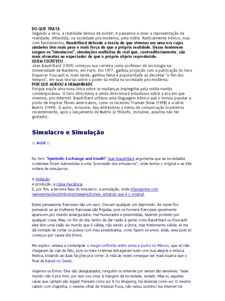 mdia. Radicalmente irnico, mas com fundamentos, Baudrillard defende a teoria de que vivemos em uma era cujos smbolos tm mais peso e mais fora do que a prpria realidade. Desse fenmeno surgem os "simulacros", simulaes malfeitas do real que, contraditoriamente, so mais atraentes ao espectador do que o prprio objeto reproduzido. QUEM ESCREVEU Jean Baudrillard (1929) comeou sua carreira como professor de sociologia na Universidade de Nanterre, em Paris. Em 1977, ganhou projeo com a publicao do livro Esquecer Foucault e, mais tarde, ganhou fama e popularidade ao decretar "o fim dos tempos", em suas teorias sobre o poder da mdia na sociedade ps-moderna. POR QUE MUDOU A HUMANIDADE Porque expe uma nova tica sobre as mudanas impingidas pela mdia navida contempornea. O livro direcionou e ainda direcionar estudiosos sobre a era em que vivemos, ps-internet. Baudrillard utilizou uma linguagem irnica que o tornou popular a ponto de inspirar filmes americanos, como os recentes Truman Show (1998) e a srie Matrix (1999). O autor, inclusive, deu entrevistas a meios de comunicao brasileiros recentemente, aps o lanamento de Matrix (o filsofo, inclusive, assumiu no ter gostado).