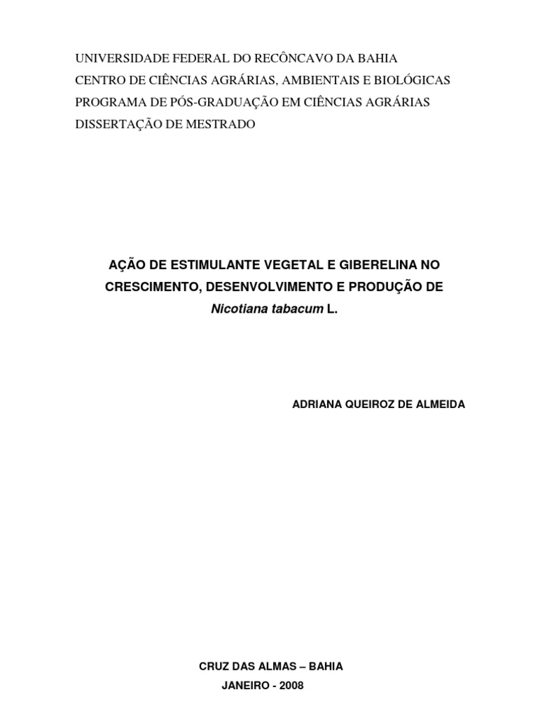 Almeida, Adriana Queiroz de. Ao de estimulante vegetal e giberelina no crescimento, desenvolvimento e produo de Nicotiana tabacum L. / Adriana Queiroz de Almeida. Cruz das Almas, Ba, 2008 77 f.: il., tab., graf. Orientador: Elvis Lima Vieira Dissertao (Mestrado) Centro de Cincias Agrrias, Ambientais e Biolgicas. Universidade Federal do Recncavo da Bahia, 2008. 1. Fumo regulador vegetal. 2. Giberelina fumo. 3. Regulador vegetal - fumo. 4. Estimulante vegetal - fumo I. Universidade Federal do Recncavo da Bahia, Centro de Cincias Agrrias, Ambientais e Biolgicas II. Ttulo. CDD 20.ed. 633.71