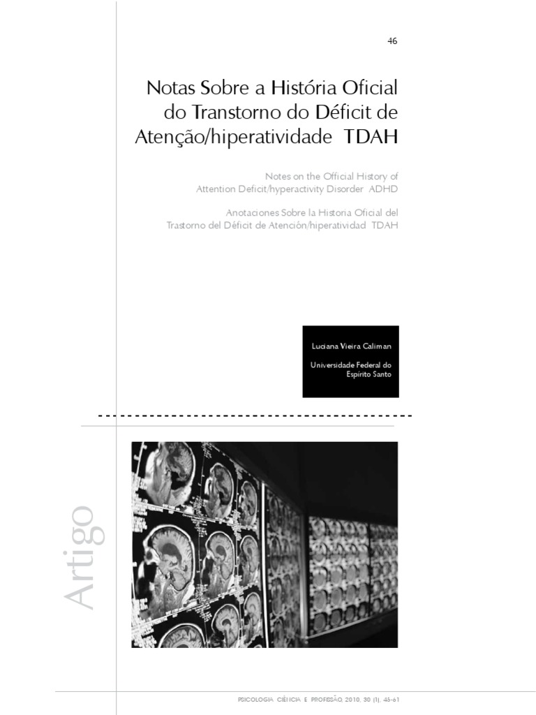 Luciana Vieira Caliman Ps-doutora em Psicologia pelo Programa de Ps-Graduao em Psicologia do Instituto de Psicologia da Universidade Federal do Rio de Janeiro, Rio de Janeiro, RJ - Brasil. Professora Adjunta do Programa de PsGraduao em Psicologia Institucional, Universidade Federal do Esprito Santo, Vitria, ES - Brasil. Endereo para envio de correspondncia: Rua Petrolino Csar de Moraes, 210, Casa 25, Mata da Praia - Vitria, ES - Brasil - CEP: 29066-320. E-mail: calimanluciana@gmail.com Recebido 18/7/2008, 1 Reformulao 13/4/2009, Aprovado 4/6/2009. Notas Sobre a Histria Oficial do Transtorno do Dficit de Ateno/hiperatividade Tdah