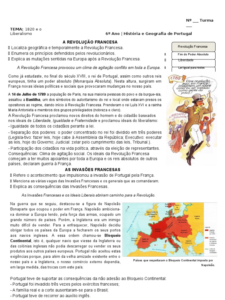 A Revoluo Francesa provocou um clima de agitao conflito em toda a Europa. Como j estudaste, no final do sculo XVIII, o rei de Portugal, assim como outros reis europeus, tinha um poder absoluto (Monarquia Absoluta). Nesta altura, surgiram em Frana novas ideias polticas e sociais que provocaram mudanas no nosso pas.
