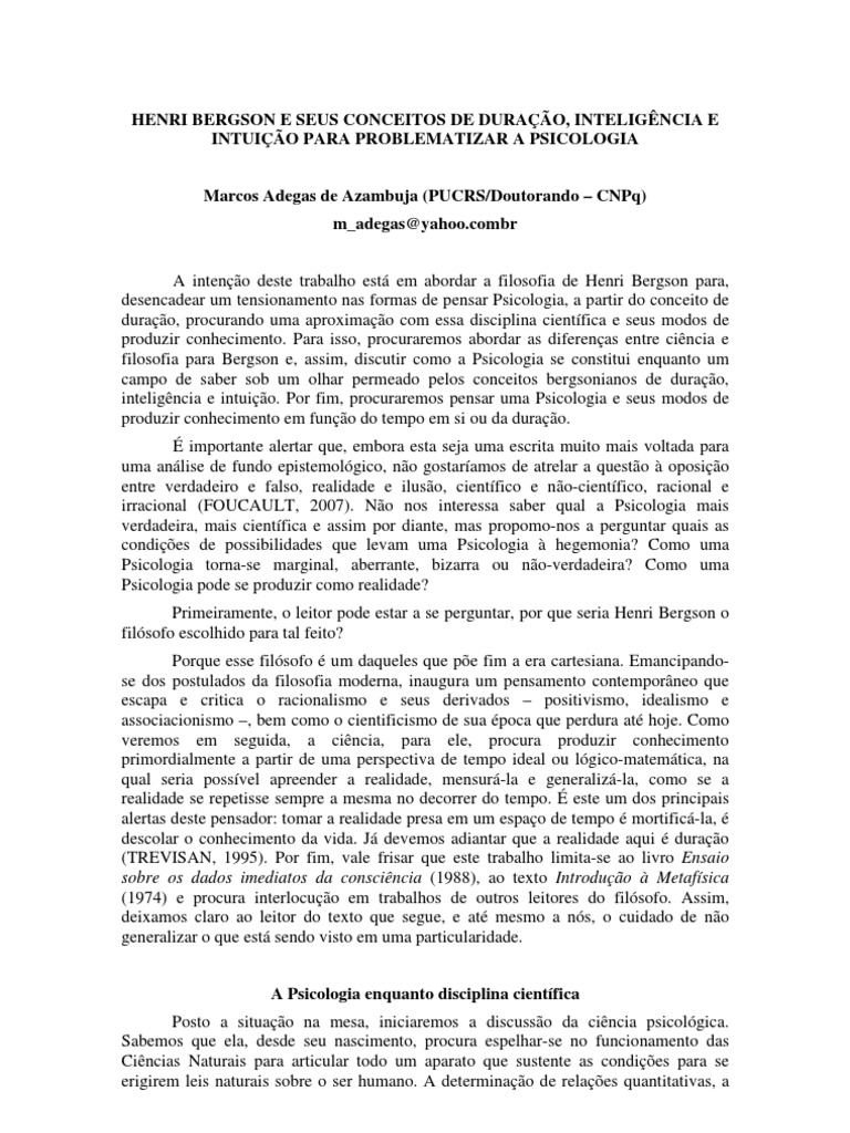 pr em xeque a busca desenfreada pela verdade, enlouquecedora aproximao com o verdadeiro (PELBART, 2004). A questo no est em crer ou no na origem e no fim, no verdadeiro e no falso, no real e no irreal. Isso no um argumento relativista, j que no queremos dizer que tudo relativo, at porque se tudo assim o fosse poderamos refutar essa premissa absolutista do prprio relativismo. Por mais que Bergson fale de uma pretenso ao absoluto, no quer dizer com isso uma busca pela verdade. Seu trabalho est preocupado justamente em alertar os cuidados que devemos ter em relao s afirmaes verdadeiras e universais que costumamos fazer sobre nossos objetos de estudo, pois h uma srie de condies histricas e especficas que condicionam nossas criaes de verdade, porque o smbolo corresponde aqui aos hbitos mais arraigados de nosso pensamento (BERGSON, 1974, p. 33). A Psicologia na durao pode nos fornecer as ferramentas para pensar aquelas teorias que esquecem os aspectos epistemolgicos e ontolgicos envolvidos na sua constituio e, ainda mais, toda uma produo de discurso, prticas e tcnicas que se alastram em nosso cotidiano como se fossem uma simples evoluo e progresso do ser humano. Pode colocar ou devolver as amarras do tempo a todo arsenal de categorias, de conceitos, de nomes e de formas aos quais significamos nossa realidade, reconstituindo, assim, suas condies de existncia em nosso presente. Referncias Bibliogrficas ALMADA, L. A crtica bergsoniana da psicofsica. In: Revista AdVerbum. 2 (1) janjun. pp. 25-37, 2007. BERGSON, H. Ensaio sobre os dados imediatos da conscincia (J. S. Gama, Trad.). Lisboa: Edies 70, 1988 (Original publicado em 1889). BERGSON, H. Introduo Metafsica. In: Os Pensadores. So Paulo, SP: Abril Cultural, 1974. DELEUZE, G. Bergsonismo. Rio de Janeiro: Ed. 34, 1999. FOUCAULT, M. A Psicologia de 1850 a 1950. Em: Da Motta, M. B., Coleo Ditos e escritos: Problematizao do Sujeito: Psicologia, Psiquiatria e Psicanlise. v. I. Rio de Janeiro: Forense Universitria, 2006. FOUCAULT, M. Do Governo dos Vivos. In: Verve. n 12. So Paulo: o Programa, 2007. PELBART, P. P. O Tempo No-Reconciliado: imagens de tempo em Deleuze. So Paulo: Perspectiva, 2004. ROSE, N. Como se deve fazer a histria do eu? In: Educao & Realidade. 26(1) janjul. pp. 33-57, 2001a. ROSE, N. Inventando nossos eus. In: Nunca fomos humanos: nos rastros do sujeito. Silva, T. T. Belo Horizonte: Autntica, 2001b. TREVISAN, R. M. Bergson e a Educao. Piracicaba: Editora Unimep, 1995. WERTHEIM, M. Uma Histria do Espao de Dante Internet. Rio de Janeiro: Jorge Zahar, 2001.