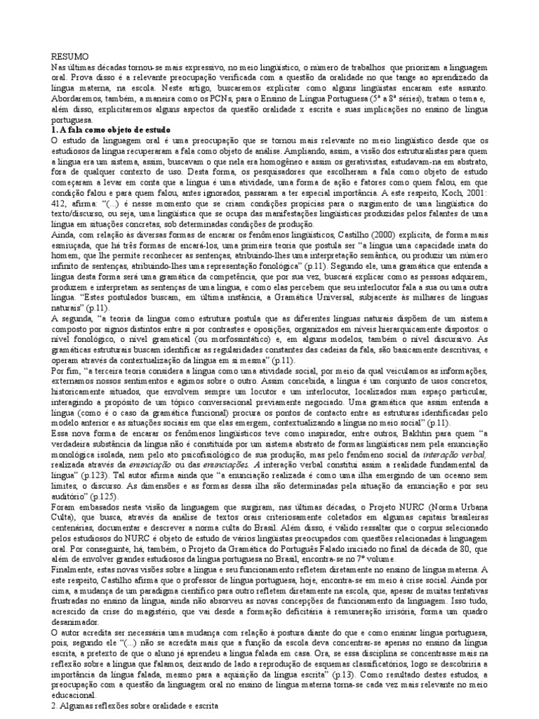 Antes de abordar a questão da oralidade e suas implicações no ensino de língua portuguesa, faz-se necessário explanar,