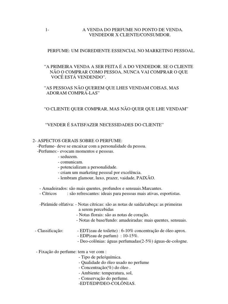 2- ASPECTOS GERAIS SOBRE O PERFUME: -Perfume- deve se encaixar com a personalidade da pessoa. -Perfumes:- evocam momentos e pessoas. - seduzem. - comunicam. - potencializam a personalidade. - criam um marketing pessoal por excelncia. - lembram glamour, luxo, prazer, vaidade, PAIXO. - Amadeirados: so mais quentes, profundos e sensuais.Marcantes. - Ctricos : so refrescantes: ideais para pessoas mais ativas, esportistas. -Pirmide olfativa: - Notas ctricas: so as notas de sada/cabea: as primeiras a serem percebidas - Notas florais: so as notas de corao. - Notas de base/fundo: amadeiradas: mais quentes, sensuais. - Classificao: - EDT(eau de toilette) : 6-10% concentrao de leo aprox. - EDP(eau de parfum) : 10-15%. - Deo-colnias: guas perfumadas(2-5%) guas-de-cologne.
