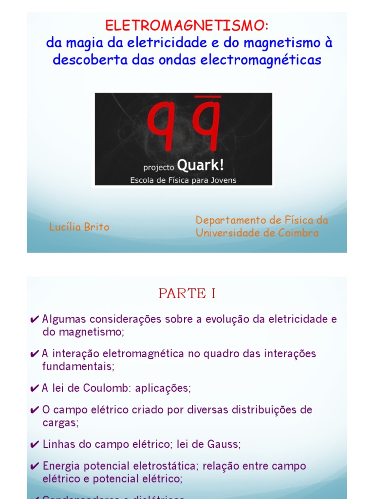 Algumas consideraes sobre a evoluo da eletricidade e do magnetismo; A interao eletromagntica no quadro das interaes fundamentais; A lei de Coulomb: aplicaes; O campo eltrico criado por diversas distribuies de cargas; Linhas do campo eltrico; lei de Gauss; Energia potencial eletrosttica; relao entre campo eltrico e potencial eltrico; Condensadores e dieltricos.