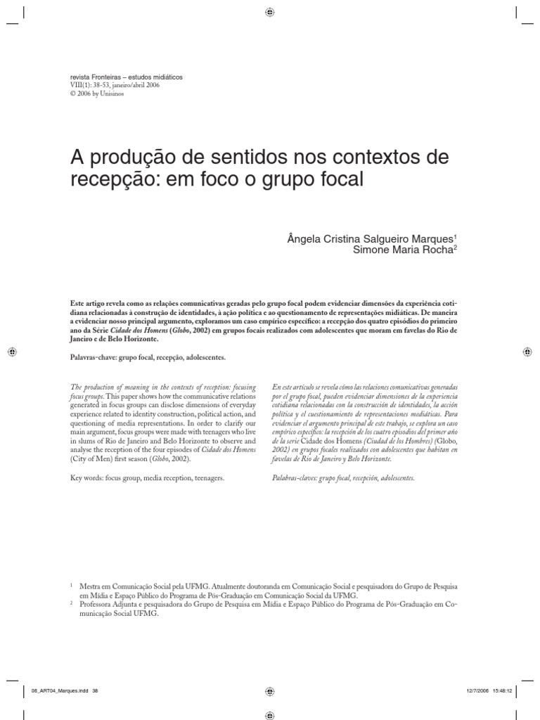 Este artigo revela como as relaes comunicativas geradas pelo grupo focal podem evidenciar dimenses da experincia cotidiana relacionadas construo de identidades, ao poltica e ao questionamento de representaes miditicas. De maneira a evidenciar nosso principal argumento, exploramos um caso emprico especco: a recepo dos quatro episdios do primeiro ano da Srie Cidade dos Homens (Globo, 2002) em grupos focais realizados com adolescentes que moram em favelas do Rio de Janeiro e de Belo Horizonte. Palavras-chave: grupo focal, recepo, adolescentes.