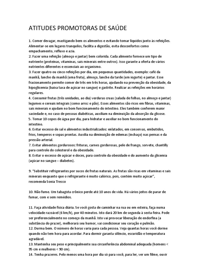 1. Comer devagar, mastigando bem os alimentos e evitando tomar lquidos junto s refeies. Alimentar-se em lugares tranquilos, facilita a digesto, evita desconfortos como empachamento, refluxo e azia. 2. Fazer uma refeio (almoo e jantar) bem colorida. Cada alimento fornece um tipo de nutriente (protenas, vitaminas, sais minerais entre outros). Isso garante a oferta de vrios nutrientes diferentes e essenciais ao organismo. 3. Fazer quatro ou cinco refeies por dia, em pequenas quantidades, exemplo: caf da manh, lanche da manh (uma fruta), almoo, lanche da tarde (um iogurte) e jantar. Esse fracionamento permite comer de trs em trs horas, ajudando na preveno da obesidade, da hipoglicemia (baixa taxa de acar no sangue) e gastrite. Realizar as refeies em horrios regulares. 4. Consumir frutas (trs unidades, ao dia) verduras cruas (salada de folhas, no almoo e jantar) legumes e cereais integrais (como arroz e po). Esses alimentos so ricos em fibras, vitaminas, sais minerais e ajudam no bom funcionamento do intestino. Eles tambm conferem maior saciedade e, no caso de pessoas diabticas, auxiliam na diminuio da absoro da glicose. 5. Tomar 10 copos de gua por dia, para hidratar e auxiliar no bom funcionamento do intestino. 6. Evitar excesso de sal e alimentos industrializados: enlatados, em conservas, embutidos, frios, temperos e sopas prontas. Auxilia na diminuio de edemas (inchao) nas pernas e da presso arterial. 7. Evitar alimentos gordurosos: frituras, carnes gordurosas, pele de frango, sorvete, chantilly para controle do colesterol e da obesidade. 8. Evitar o excesso de acar e doces, para controle da obesidade e do aumento da glicemia (acar no sangue diabetes). 9. Substituir refrigerantes por sucos de frutas naturais. As frutas so ricas em vitaminas e sais minerais enquanto que o refrigerante muito calrico, pois, contm muito acar, recomenda Sonia Trecco 10. No fume. Um tabagista crnico perde at 10 anos de vida. H vrios jeitos de parar de fumar, com e sem remdios. 11. Faa atividade fsica diria. Se voc gosta de caminhar na rua ou em esteira, faa numa velocidade razovel (6 km/h), por 40 minutos. Isto dar 20 km de segunda sexta-feira. Pode ser preferencialmente no comeo da manh. Isto vai provocar liberao de endorfina (a substncia do prazer), melhorar seu humor, vai condicionar seu corao e pulmo. 12. Durma bem. O nmero de horas varia para cada pessoa. Veja quantas horas voc dorme quando no tem hora para acordar. Para dormir garanta silncio, escurido e temperatura agradvel. 13. Mantenha seu peso e principalmente sua circunferncia abdominal adequada (homens < 95 cm e mulheres < 90 cm). 14. Tenha prazeres. Pelo menos uma hora por dia s para voc, para ler, ver um filme, ouvir