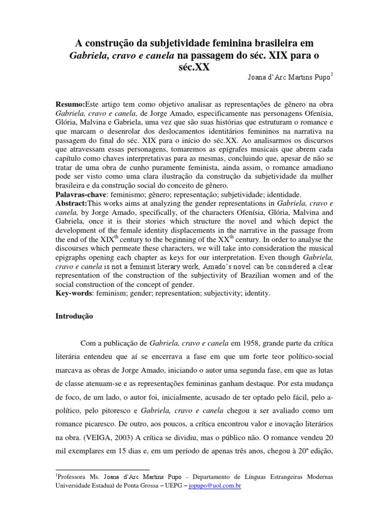 tendo ganhado vários prêmios, entre os quais o prêmio Machado de Assis, do Instituto Nacional do Livro; e o Jabuti, da Câmara Brasileira do Livro. Do ponto de vista da recepção e considerando o que nos ensina Jauss (1994) que “tanto em seu caráter artístico quanto em sua historicidade, a obra literária é condicionada primordialmente pela relação dialógica entre literatura e leitor”, acreditamos que as leituras contemporâneas, influenciadas pelas perspectivas pós- modernas, pelos estudos culturais, bem como pela crítica feminista, podem contribuir para o estudo do romance em questão, sobretudo no que dizem respeito à raça, gênero, nação, sexo na literatura brasileira e neste sentido contribuem os estudos de Abdala Junior, (2002); Duarte, (1997); Miskolci & Carvalho, (2006). Mas, diante da complexidade em que estão envolvidas tais categorias de análise, em muitos desses trabalhos persistem discussões em torno dos significados suscitados pelas representações discursivas neste romance. Gabriela, cravo e canela pode ser lida como uma obra que se ocupa em profundidade da representação do gênero, retratando a possibilidade de uma constituição da subjetividade feminina através da emancipação do desejo sexual, bem como uma crônica de costumes, que retrata também a nação e a sociedade brasileiras, veiculadoras do discurso masculinista do patriarcado. É neste campo de tensões identitárias que se dá o romance e dessa perspectiva, a nossa leitura. Pontuaremos, neste trabalho, algumas das representações do gênero feminino que apontam para os processos de construção das subjetividades, assumindo que, Gabriela, cravo e canela não é uma obra feminista, mas que pode ser compreendida como uma representação da subjetividade feminina dentro das condições sócio- históricas que aí se fazem representar. Em nossa leitura, propomos observar a construção de algumas subjetividades femininas, a partir do próprio texto de Jorge Amado e, de posse de algumas reflexões propostas pela crítica feminista. Nossa escolha teórica decorre do fato de que, desde suas primeiras teses, a crítica feminista tomou para si a tarefa de denunciar a opressão e a discriminação das mulheres, e ainda pelo fato de que as teorias feministas pós-modernas, ao trazerem o gênero como categoria de análise, colaboraram enormemente para o deslocamento do conceito iluminista do sujeito cartesiano, de “identidade fixa e estável” para a concepção das “identidades abertas, contraditórias, inacabadas, fragmentadas, do sujeito pós-moderno” (HALL, 2005, p.46) Acreditamos que a cada nova abordagem no decorrer da história do movimento feminista, diferentes aspectos na constituição das subjetividades foram iluminando o caminho das gerações feministas seguintes em busca da desestabilização de certas