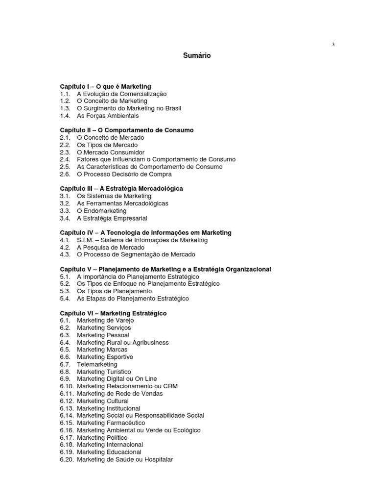 Captulo I O que Marketing 1.1. A Evoluo da Comercializao 1.2. O Conceito de Marketing 1.3. O Surgimento do Marketing no Brasil 1.4. As Foras Ambientais Captulo II O Comportamento de Consumo 2.1. O Conceito de Mercado 2.2. Os Tipos de Mercado 2.3. O Mercado Consumidor 2.4. Fatores que Influenciam o Comportamento de Consumo 2.5. As Caractersticas do Comportamento de Consumo 2.6. O Processo Decisrio de Compra Captulo III A Estratgia Mercadolgica 3.1. Os Sistemas de Marketing 3.2. As Ferramentas Mercadolgicas 3.3. O Endomarketing 3.4. A Estratgia Empresarial Captulo IV A Tecnologia de Informaes em Marketing 4.1. S.I.M. Sistema de Informaes de Marketing 4.2. A Pesquisa de Mercado 4.3. O Processo de Segmentao de Mercado Captulo V Planejamento de Marketing e a Estratgia Organizacional 5.1. A Importncia do Planejamento Estratgico 5.2. Os Tipos de Enfoque no Planejamento Estratgico 5.3. Os Tipos de Planejamento 5.4. As Etapas do Planejamento Estratgico Captulo VI Marketing Estratgico 6.1. Marketing de Varejo 6.2. Marketing Servios 6.3. Marketing Pessoal 6.4. Marketing Rural ou Agribusiness 6.5. Marketing Marcas 6.6. Marketing Esportivo 6.7. Telemarketing 6.8. Marketing Turstico 6.9. Marketing Digital ou On Line 6.10. Marketing Relacionamento ou CRM 6.11. Marketing de Rede de Vendas 6.12. Marketing Cultural 6.13. Marketing Institucional 6.14. Marketing Social ou Responsabilidade Social 6.15. Marketing Farmacutico 6.16. Marketing Ambiental ou Verde ou Ecolgico 6.17. Marketing Poltico 6.18. Marketing Internacional 6.19. Marketing Educacional 6.20. Marketing de Sade ou Hospitalar