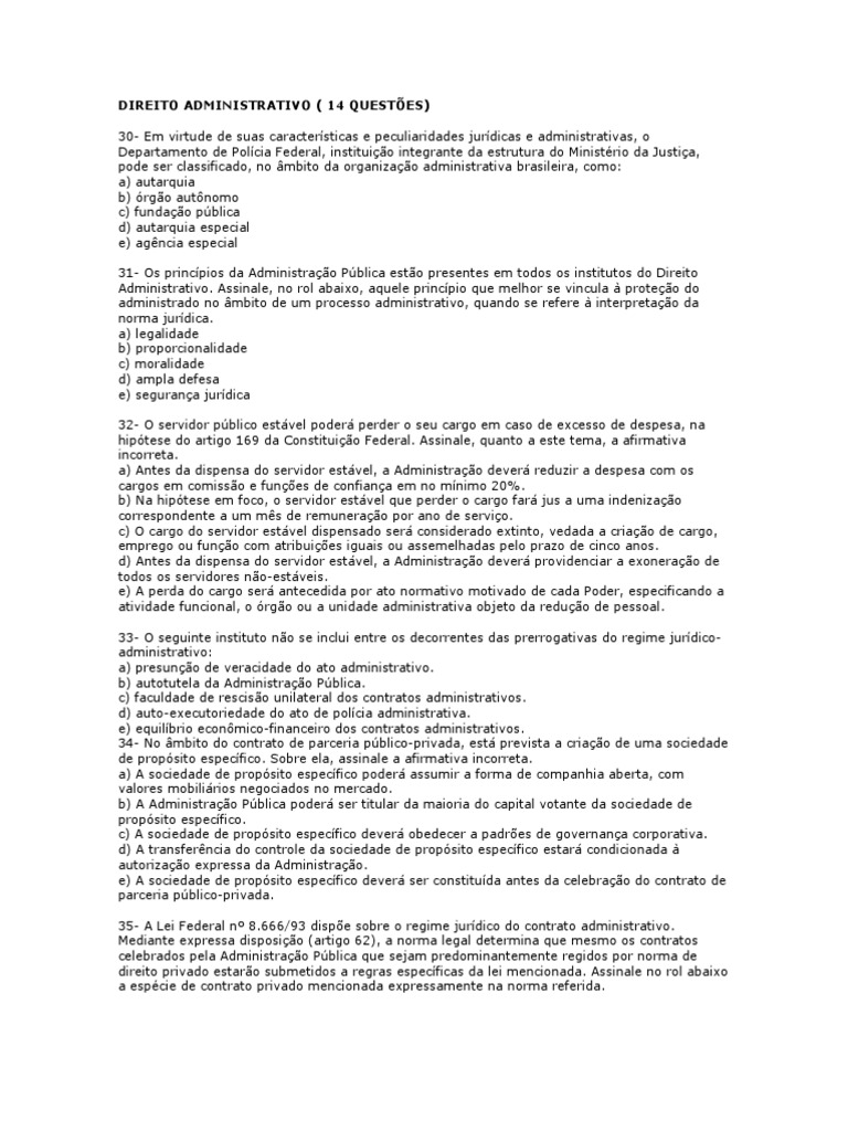 da estrutura do Ministrio da Justia, pode ser classificado, no mbito da organizao administrativa brasileira, como: a) autarquia b) rgo autnomo c) fundao pblica d) autarquia especial e) agncia especial 31- Os princpios da Administrao Pblica esto presentes em todos os institutos do Direito Administrativo. Assinale, no rol abaixo, aquele princpio que melhor se vincula proteo do administrado no mbito de um processo administrativo, quando se refere interpretao da norma jurdica. a) legalidade b) proporcionalidade c) moralidade d) ampla defesa e) segurana jurdica 32- O servidor pblico estvel poder perder o seu cargo em caso de excesso de despesa, na hiptese do artigo 169 da Constituio Federal. Assinale, quanto a este tema, a afirmativa incorreta. a) Antes da dispensa do servidor estvel, a Administrao dever reduzir a despesa com os cargos em comisso e funes de confiana em no mnimo 20%. b) Na hiptese em foco, o servidor estvel que perder o cargo far jus a uma indenizao correspondente a um ms de remunerao por ano de servio. c) O cargo do servidor estvel dispensado ser considerado extinto, vedada a criao de cargo, emprego ou funo com atribuies iguais ou assemelhadas pelo prazo de cinco anos. d) Antes da dispensa do servidor estvel, a Administrao dever providenciar a exonerao de todos os servidores no-estveis. e) A perda do cargo ser antecedida por ato normativo motivado de cada Poder, especificando a atividade funcional, o rgo ou a unidade administrativa objeto da reduo de pessoal. 33- O seguinte instituto no se inclui entre os decorrentes das prerrogativas do regime jurdicoadministrativo: a) presuno de veracidade do ato administrativo. b) autotutela da Administrao Pblica. c) faculdade de resciso unilateral dos contratos administrativos. d) auto-executoriedade do ato de polcia administrativa. e) equilbrio econmico-financeiro dos contratos administrativos. 34- No mbito do contrato de parceria pblico-privada, est prevista a criao de uma sociedade de propsito especfico. Sobre ela, assinale a afirmativa incorreta. a) A sociedade de propsito especfico poder assumir a forma de companhia aberta, com valores mobilirios negociados no mercado. b) A Administrao Pblica poder ser titular da maioria do capital votante da sociedade de propsito especfico. c) A sociedade de propsito especfico dever obedecer a padres de governana corporativa. d) A transferncia do controle da sociedade de propsito especfico estar condicionada autorizao expressa da Administrao. e) A sociedade de propsito especfico dever ser constituda antes da celebrao do contrato de parceria pblico-privada. 35- A Lei Federal n 8.666/93 dispe sobre o regime jurdico do contrato administrativo. Mediante expressa disposio (artigo 62), a norma legal determina que mesmo os contratos celebrados pela Administrao Pblica que sejam predominantemente regidos por norma de direito privado estaro submetidos a regras especficas da lei mencionada. Assinale no rol abaixo a espcie de contrato privado mencionada expressamente na norma referida.